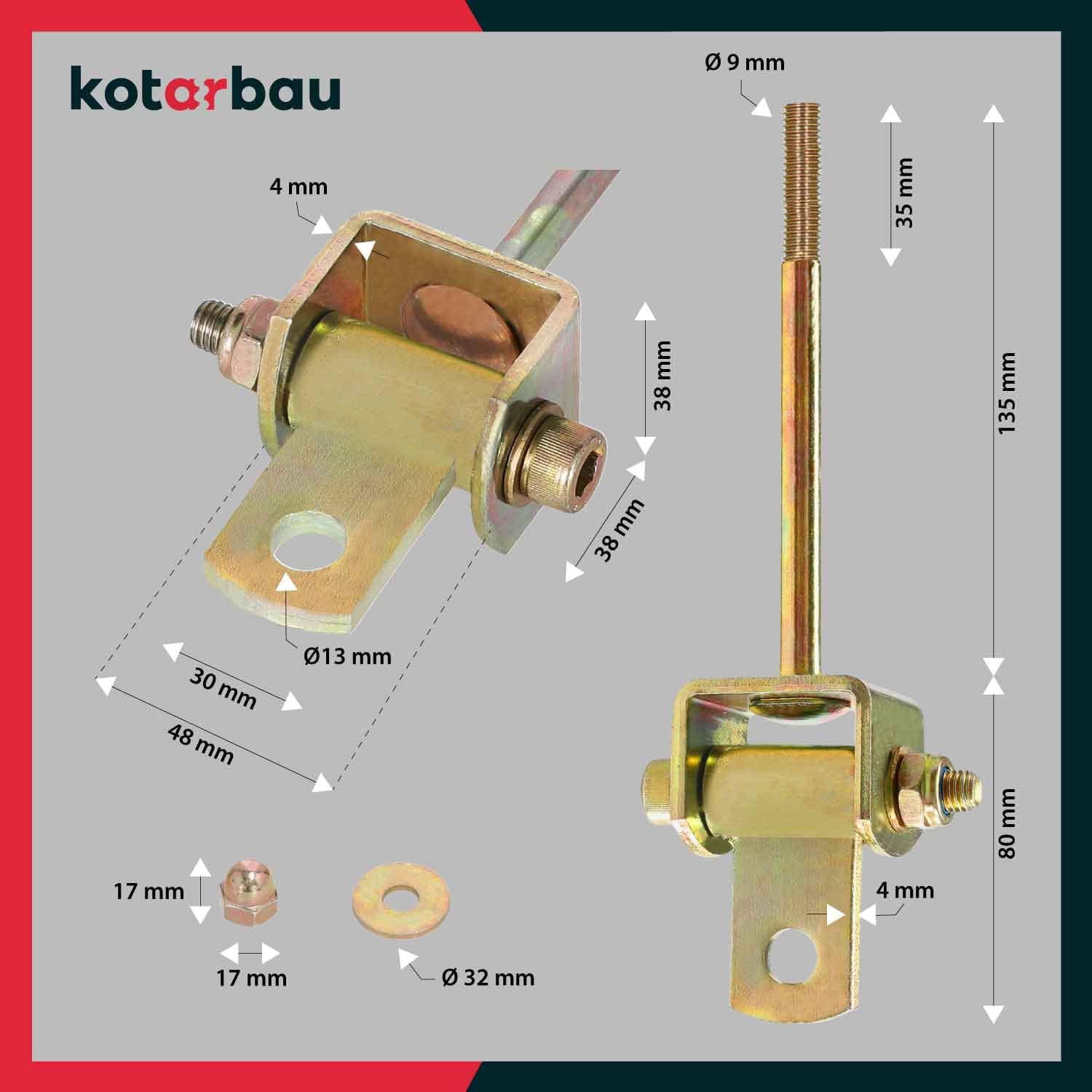 - TECHNISCHE DATEN – Satz 2 Stück - Gewinde: Ø 9 mm – Länge der Gewinde: 118 mm – Mutter: Ø 30 mm – Stärke: 4 mm – Schrauben: M10 - Oberfläche: Verzinkt – Material: Stahl – Gewicht: 820g