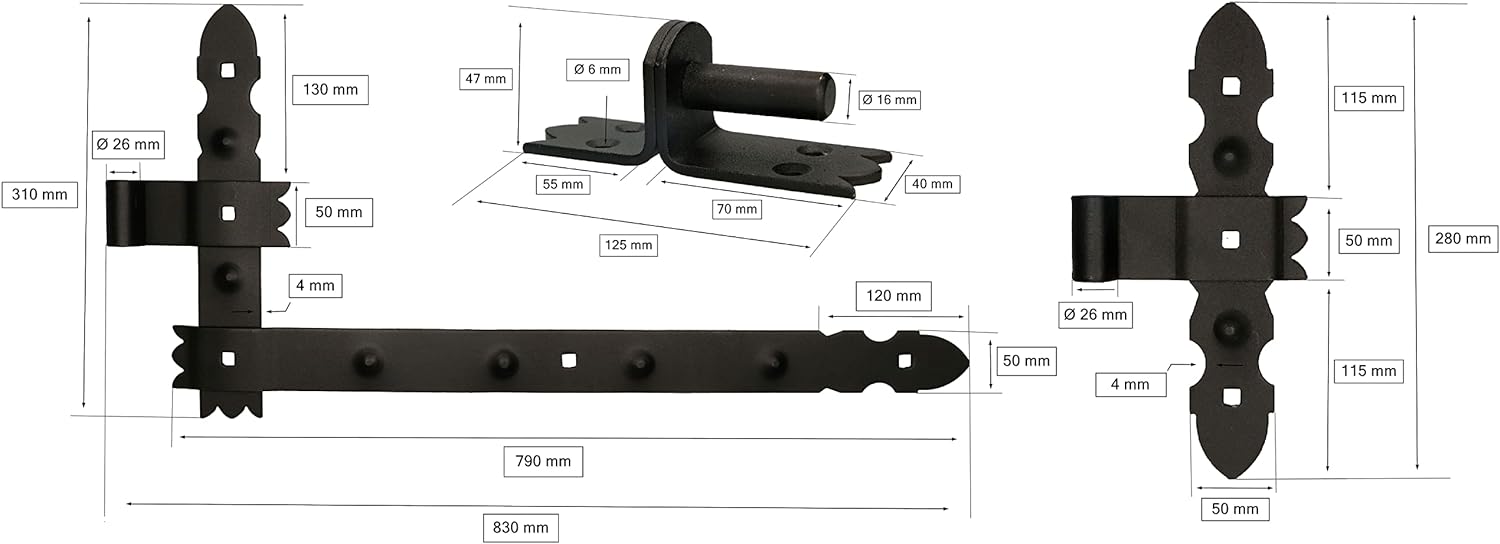 - TECHNISCHE DATEN - Höhe: 310 mm, Länge: 790 mm, Gesamtlänge: 830 mm, Durchmesser des Befestigungsbohrung: 26 mm, Breite: 50 mm, Stärke: 4 mm, Kloben - Abmessungen des Bolzens: 125x40 mm, Tiefe: 47 mm, Durchmesser des Befestigungslochs: 6 mm,