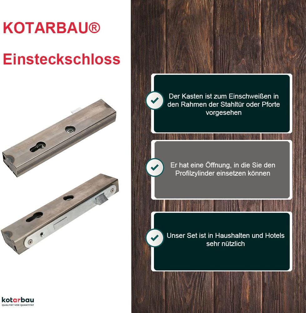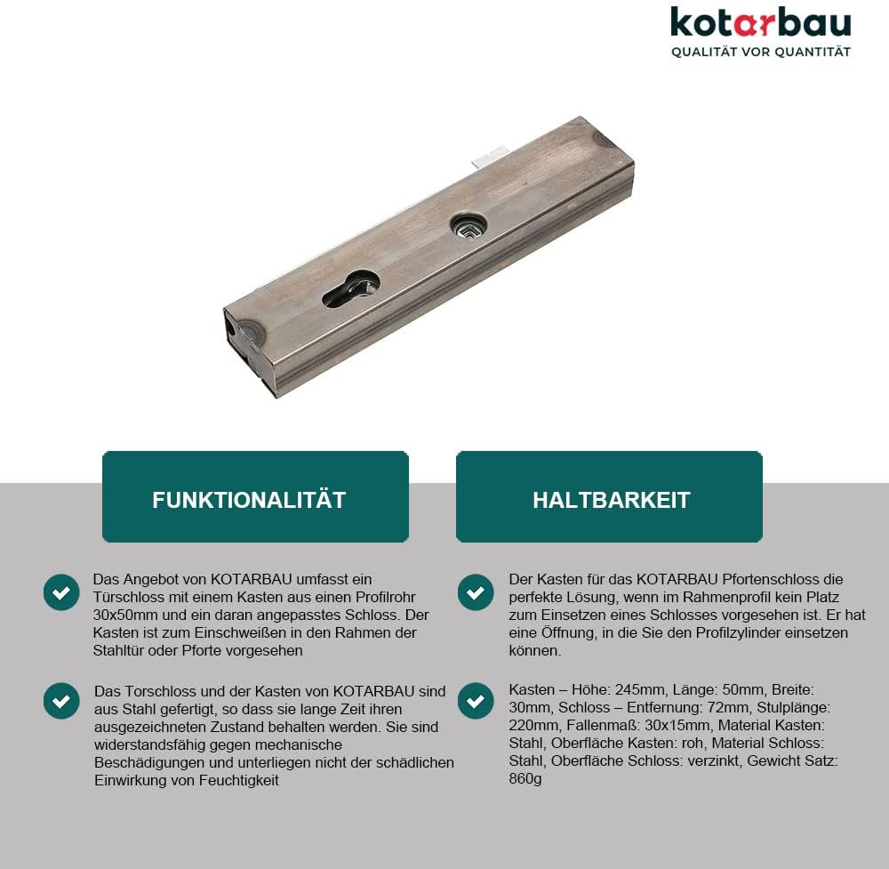 - FUNKTIONALITÄT – Das Angebot von KOTARBAU umfasst ein Türschloss mit einem Kasten aus einen Profilrohr 30x50mm und ein daran angepasstes Schloss. Der Kasten ist zum Einschweissen in den Rahmen der Stahltür oder Pforte vorgesehen. Er hat eine