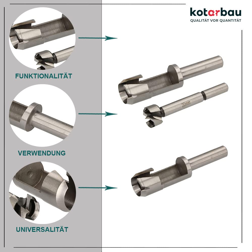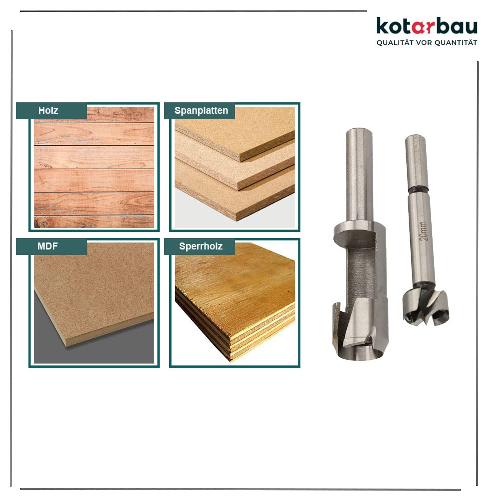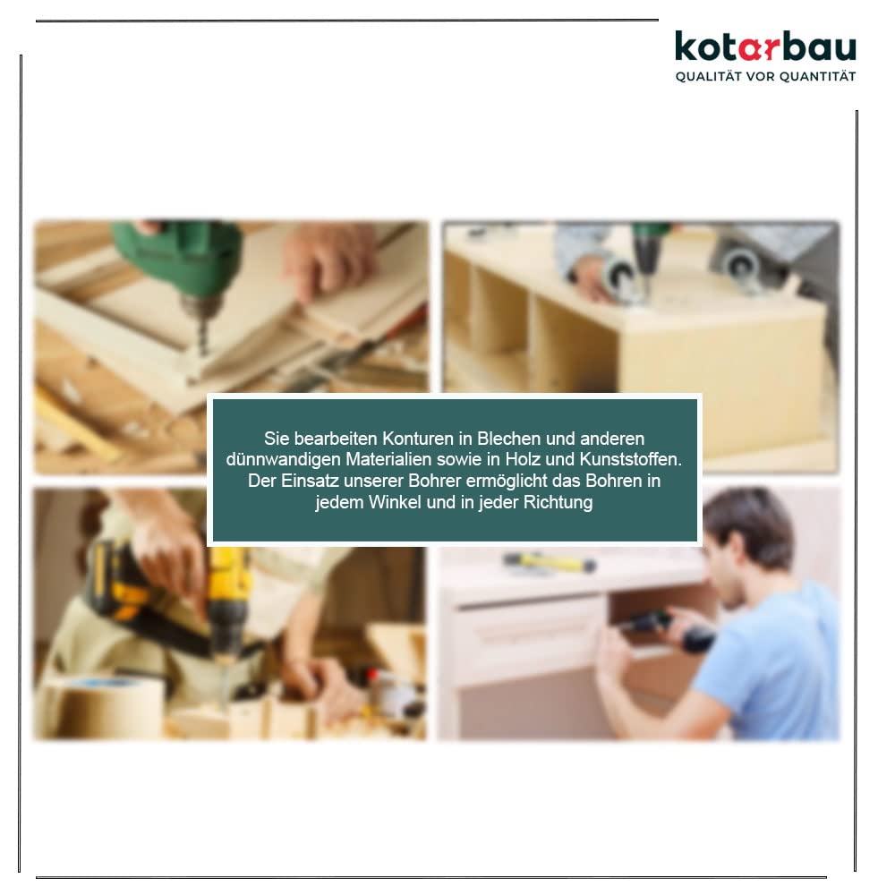 - UNIVERSALITÄT – Der KOTARBAU Fräser & Bohrer Satz dient zum Bohren von Löchern in trockenem, feuchtem und frischem Holz, Ästen, Möbelplatten, Gipskartonplatten und Spanplatten. Unser Werkzeugsatz wird Ihnen behilflich sein beim Bohren von Buchsen