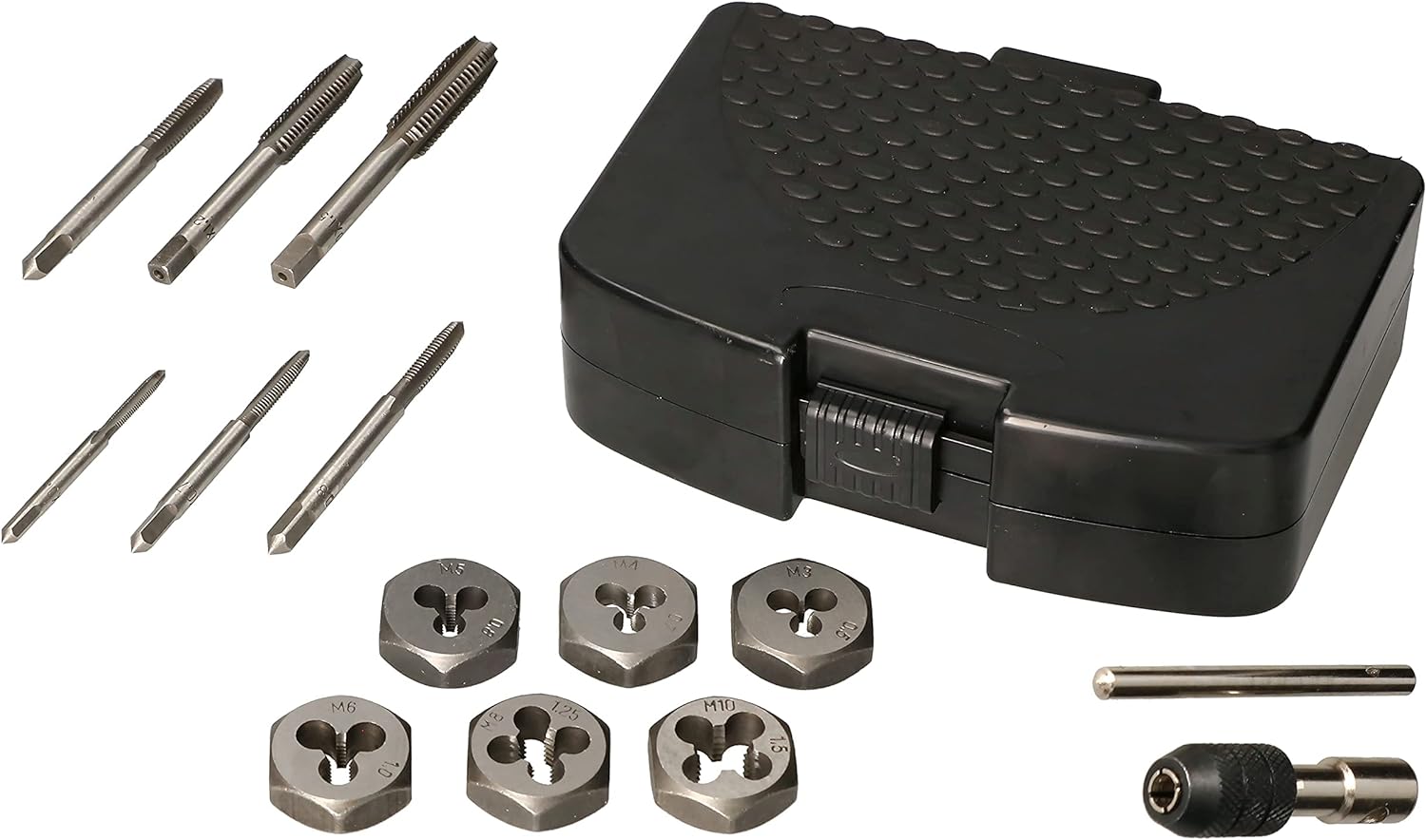 - DER KOMPLETTE KOTARBAU SATZ besteht aus Gewindebohrern: M3x0,5 mm, M4x0,7 mm, M5x0,8 mm, M6x1,0 mm, M8x1,25 mm, M10x1,5 mm, Gewindeschneidern: M3, M4, M5, M6, M8, M10, Windeisen und einem stabilen Kasten.