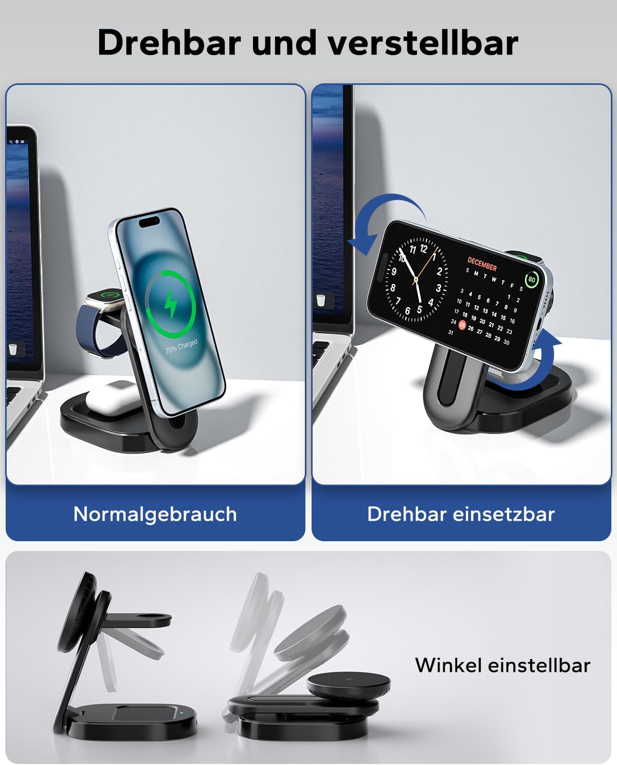 - Tarke Magnete ermöglichen effizientes kabelloses Laden: Unsere 3-in-1-Ladestation ist mit hochwertigen Magneten ausgestattet, die eine sofortige und präzise Ausrichtung auf den optimalen Bereich für kabelloses Laden ermöglichen. Die magnetische