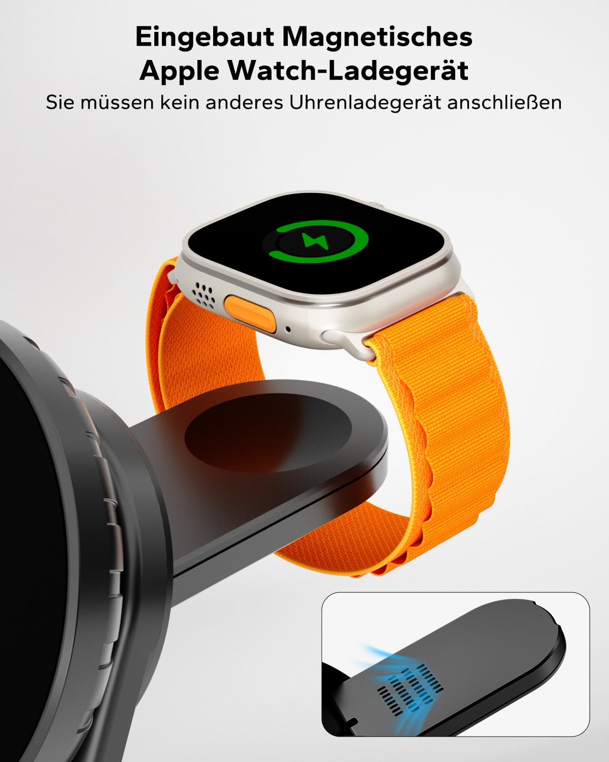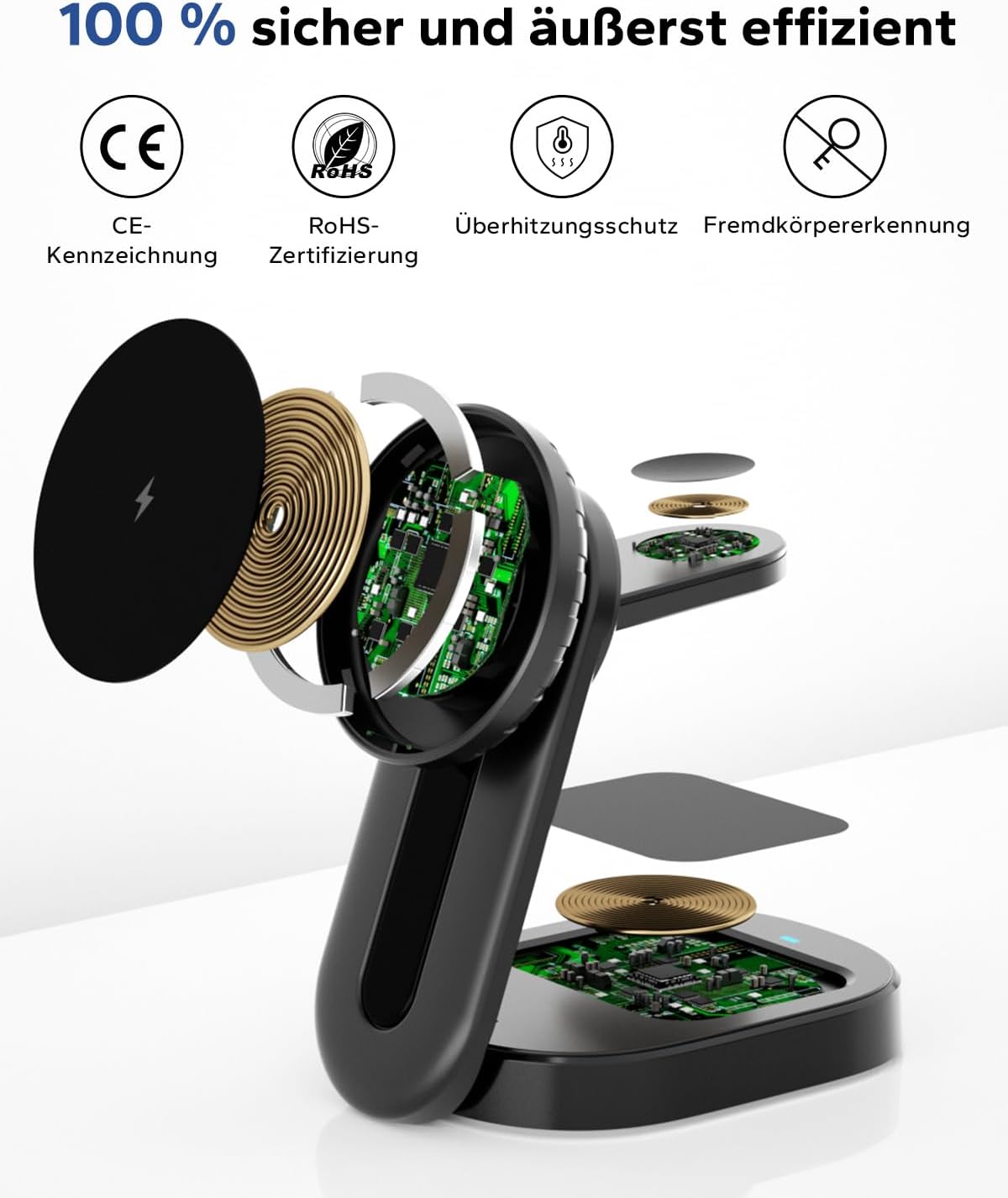 - Magsafe Ladestation 3 in 1: Unsere induktive Ladestation lädt das iPhone, die Apple Watch und die Airpods gleichzeitig und ist kompatibel mit der iPhone 12-16 Serie, der Apple Watch 2-10/SE Serie und den Airpods 2-4 Serien. Dieses Magsafe-Ladegerät ist