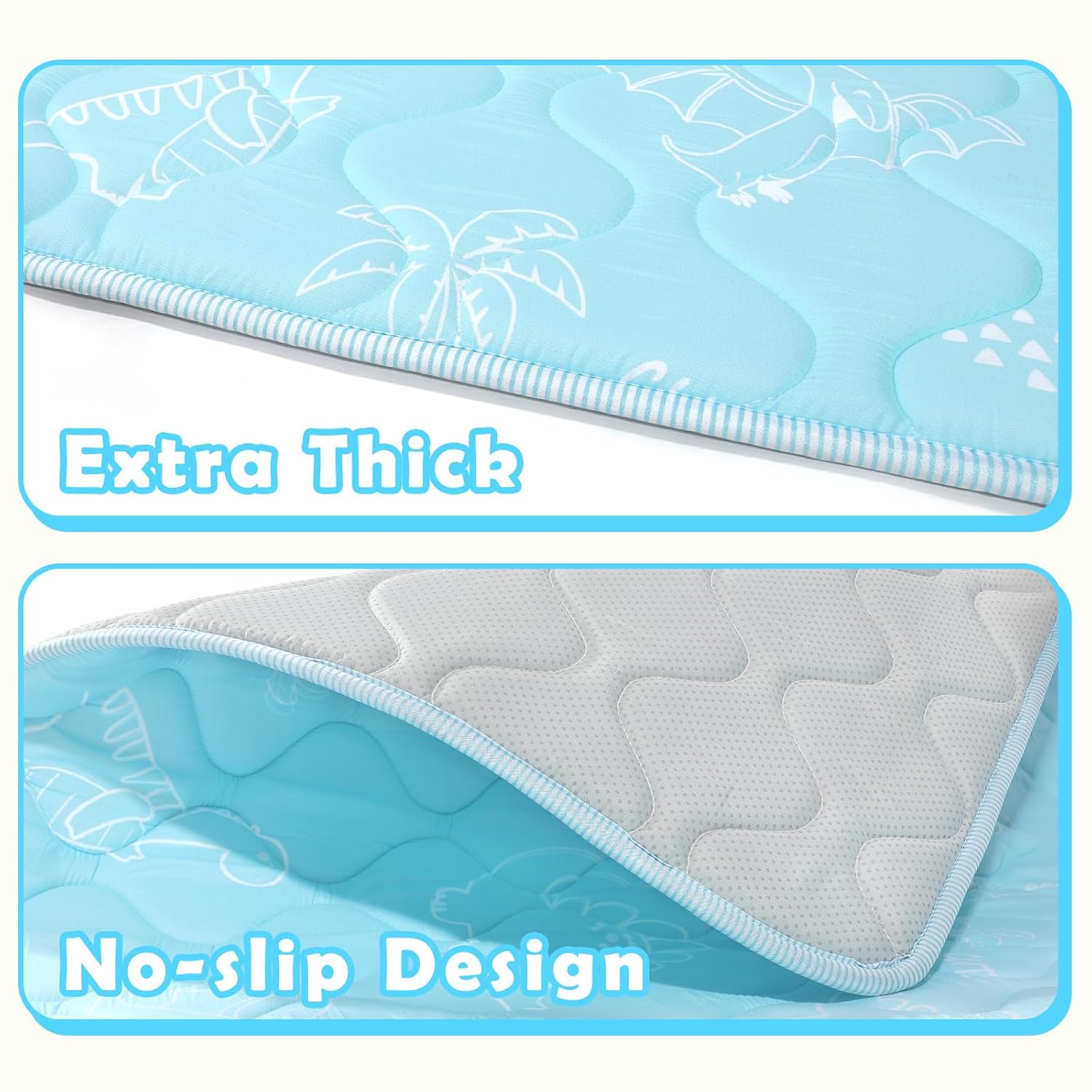 - Dämpfung und Rutschfestigkeit: Die Unterseite unserer Babykrabbelmatte ist mit rutschfesten Silikondots ausgestattet, die den Boden fest greifen – so können Babys sich frei krabbeln und wälzen. Die obere Schicht ist weich und dämpfend, während die