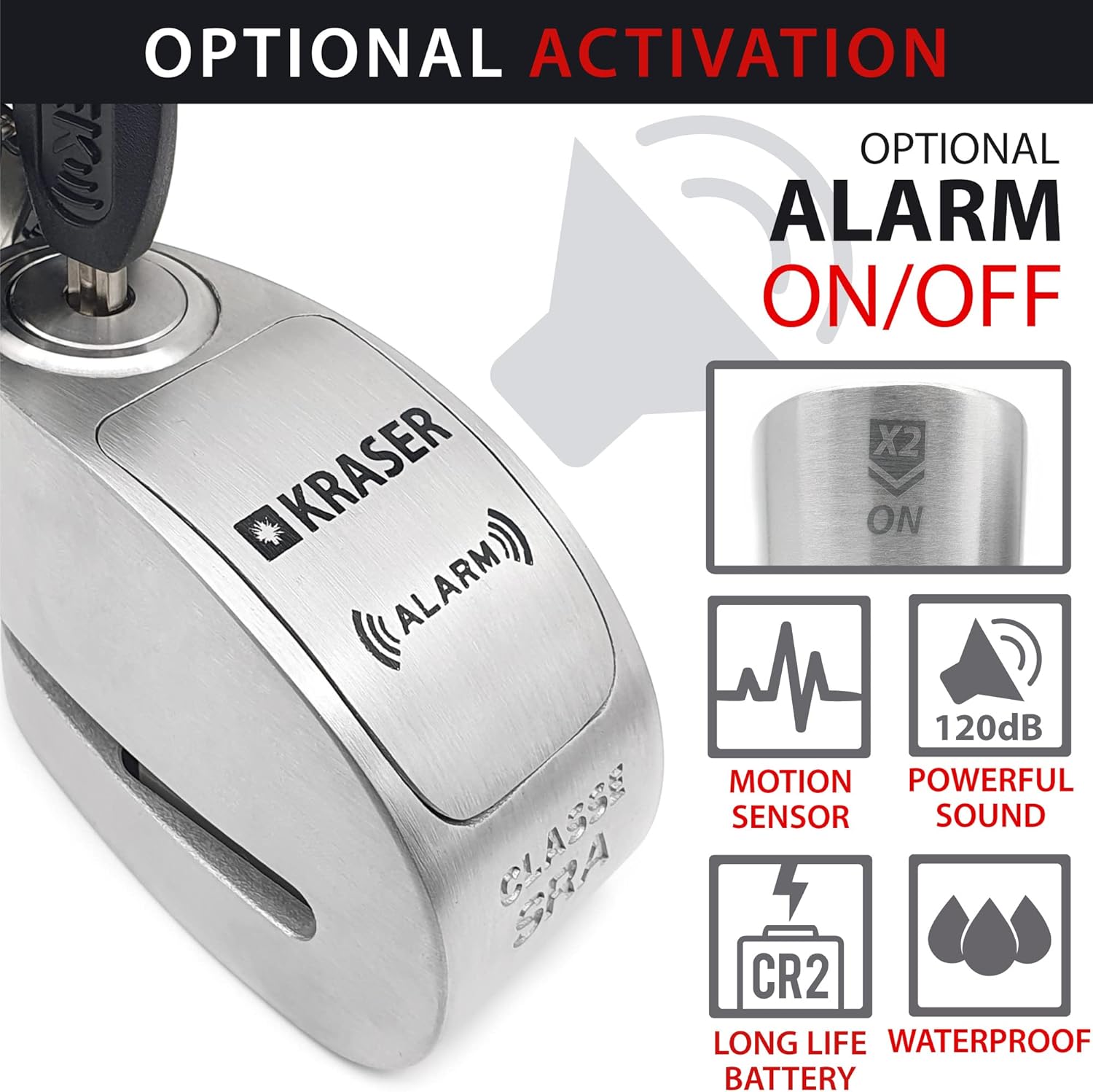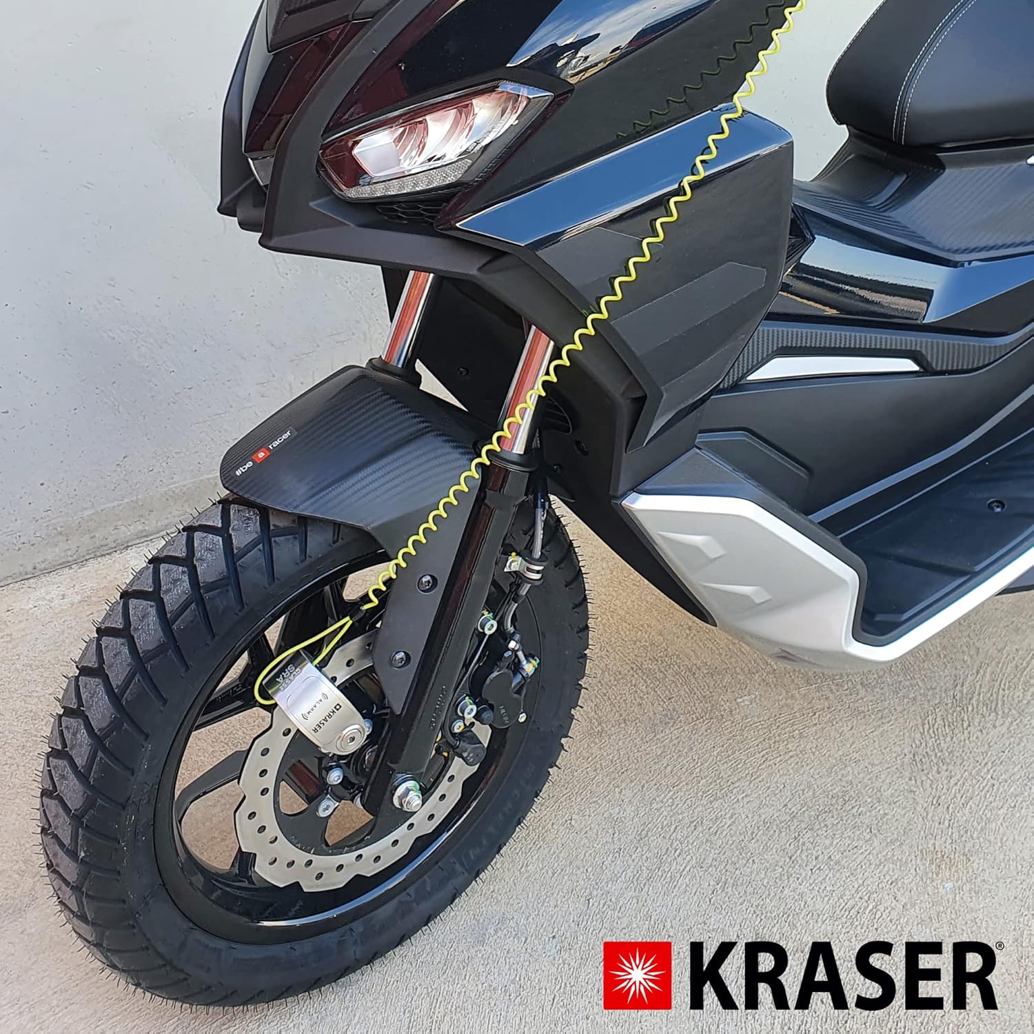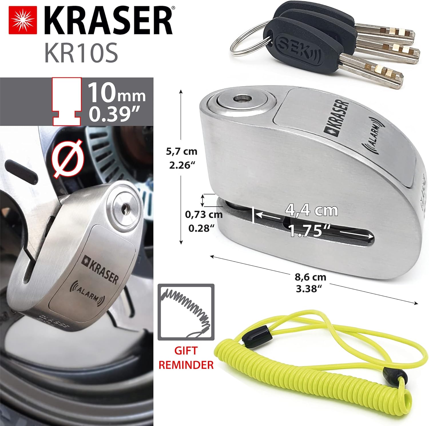 • KRASER: Bremsscheibenschloss Motorrad Marke KRASER von Equipmotor, einem etablierten Werk mit langjähriger Erfahrung in Wegfahrsperren und Garantie und Kundenservice aus Europa.