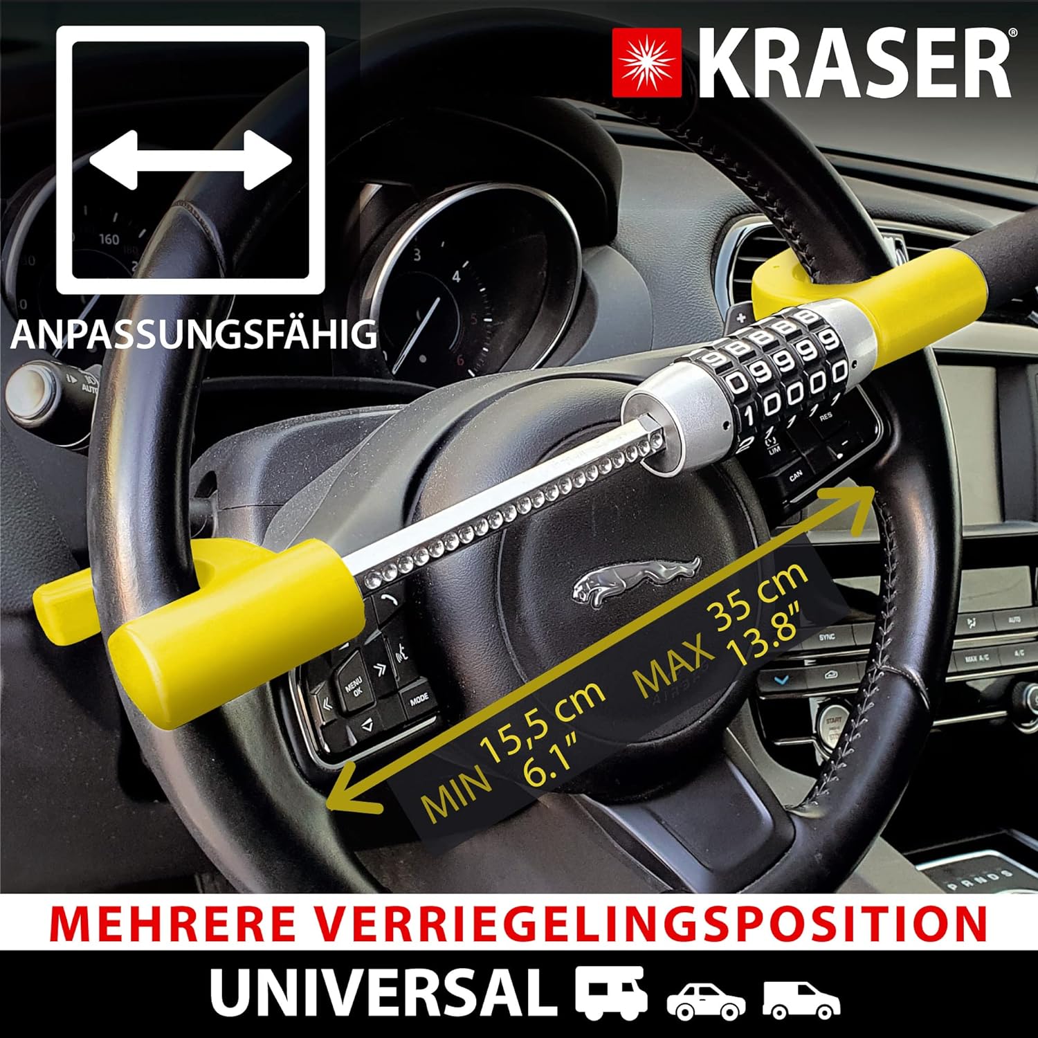 - GARANTIE: Lenkradkralle Marke KRASER von Equipmotor, einem etablierten Werk mit langjähriger Erfahrung in Wegfahrsperren. Lenkradsperre mit 2 Jahre Garantie und Kundenservice aus Europa.