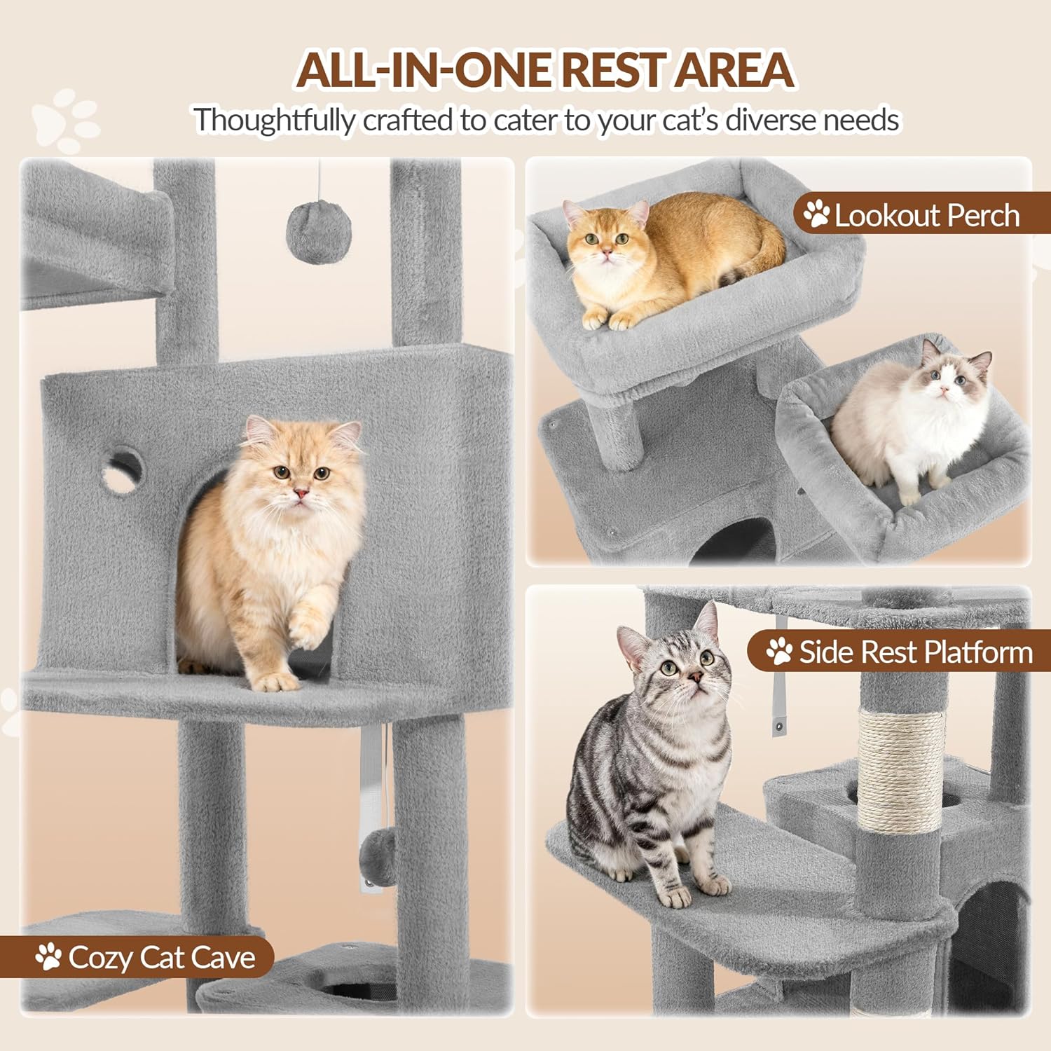 - Vertikales Layout und gut durchdachte Laufwege: Die vertikale Struktur minimiert den Platzbedarf, während optimierte Laufwege eine ungehinderte Bewegung der Katze gewährleisten. Es spart wertvollen Platz in der Wohnung, passt perfekt in kleine