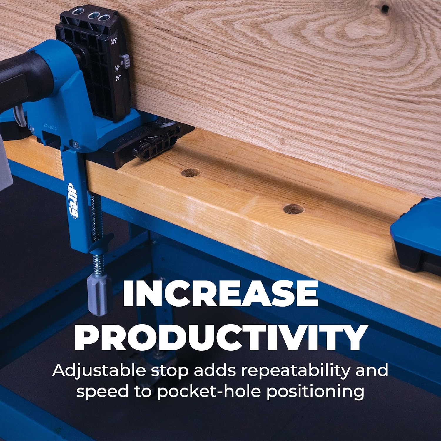 - Adjustable stop adds repeatability and speed to pocket-hole positioning