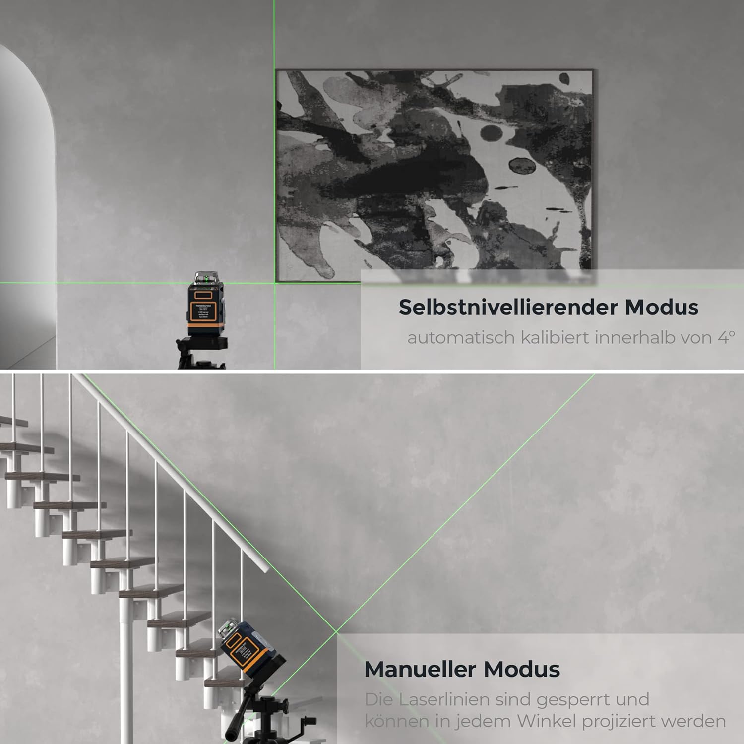 - 【 Einfach zu bedienen 】 Das 2 x 360° Nivelliergerät projiziert horizontal und vertikal einen 360° Laserstrahl, der parallel zum Boden, der Decke und der Wand ausgerichtet werden kann. Beide Laserlinien verfügen über entsprechende Tasten am