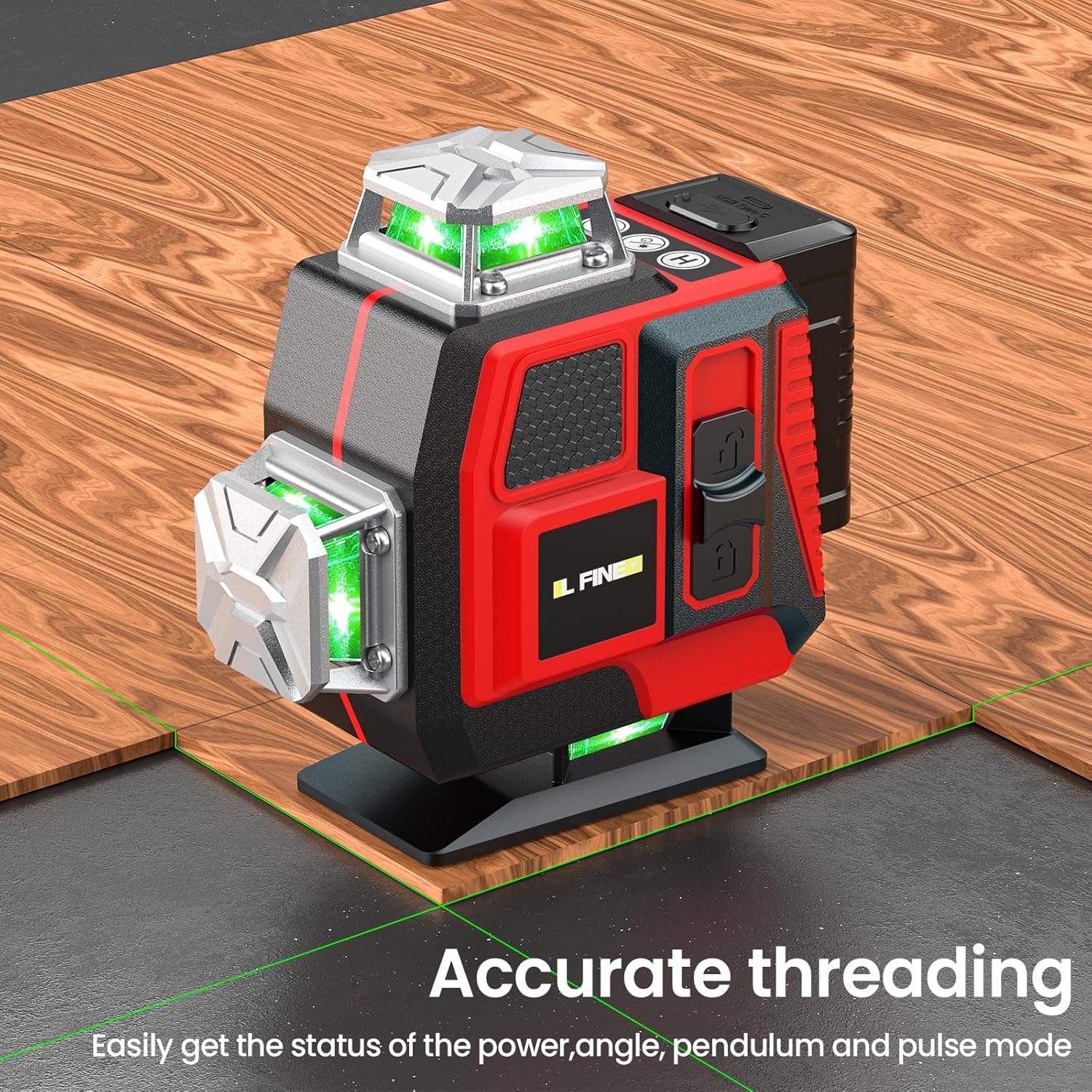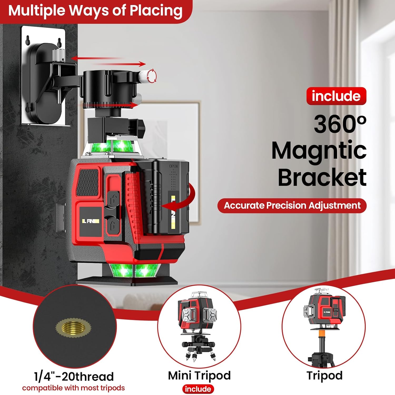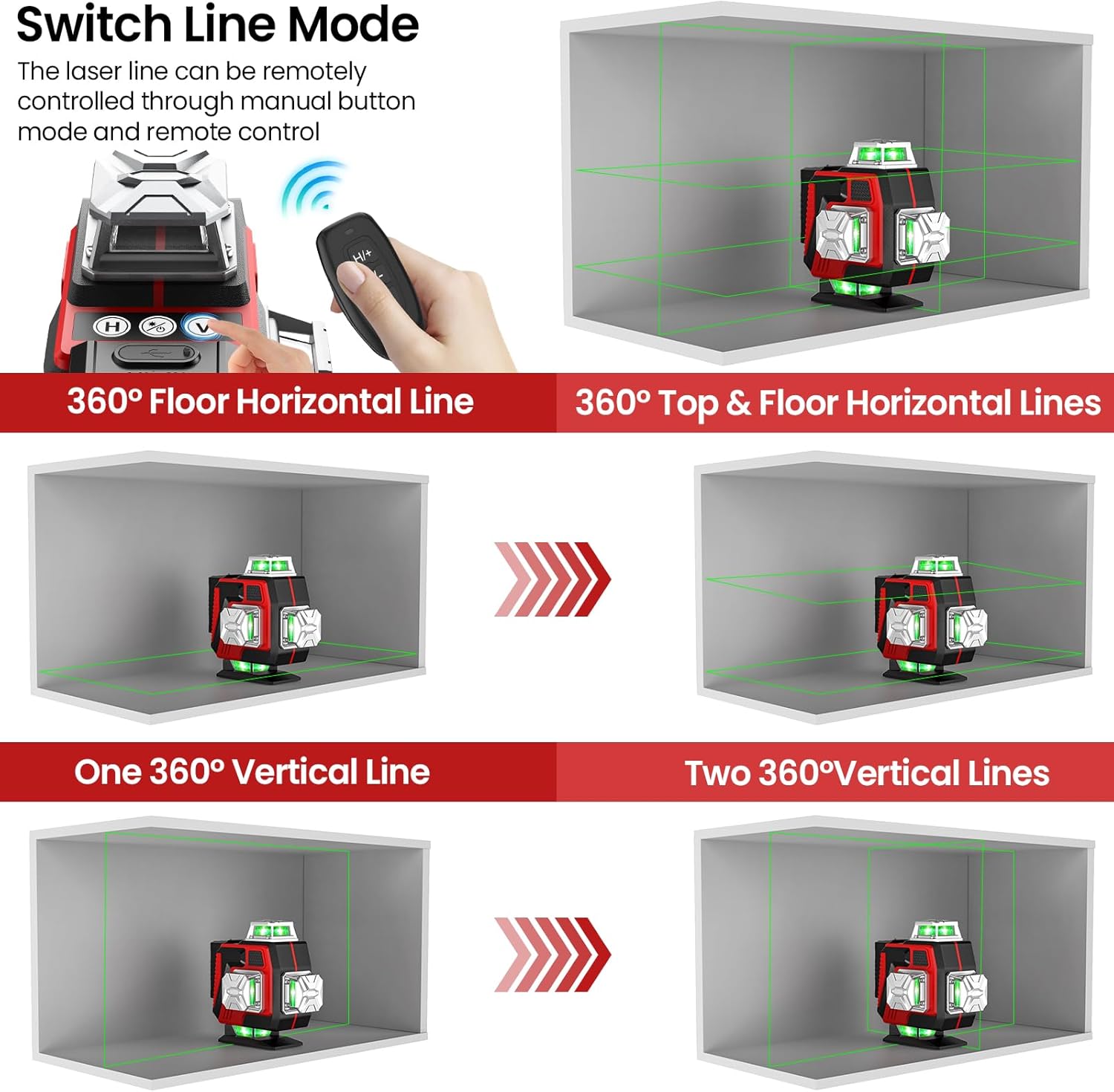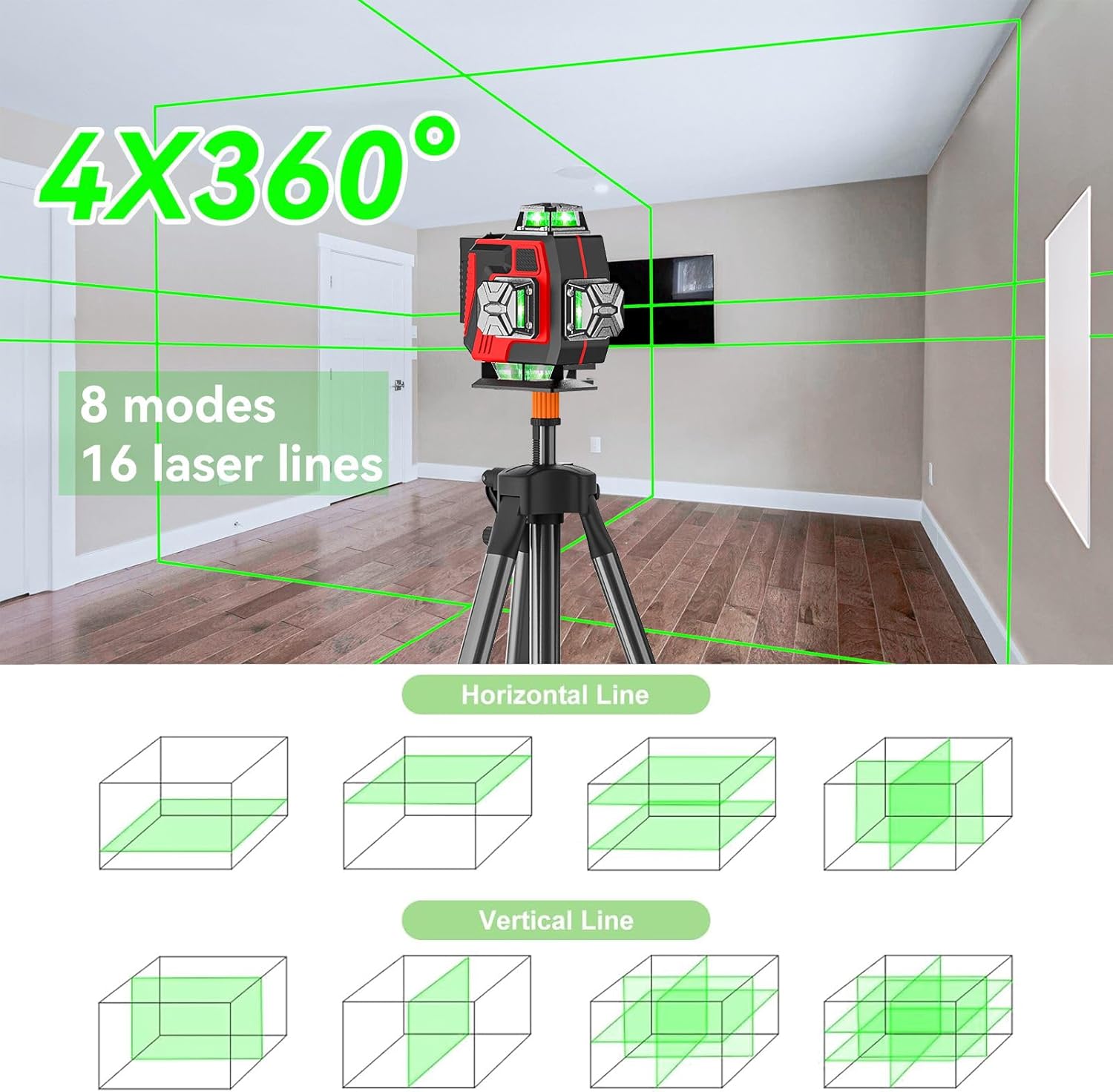 - 【Kreuzlinienlaser Grün 4 x 360°】. Dieses kreuzlinienlaser hat zwei horizontale Ebenen von 360° und zwei vertikale Ebenen von 360°. Diese Laser Wasserwaage kann den Boden, die Wände und die Decke eines ganzen Raums abdecken. Er hilft Ihnen,