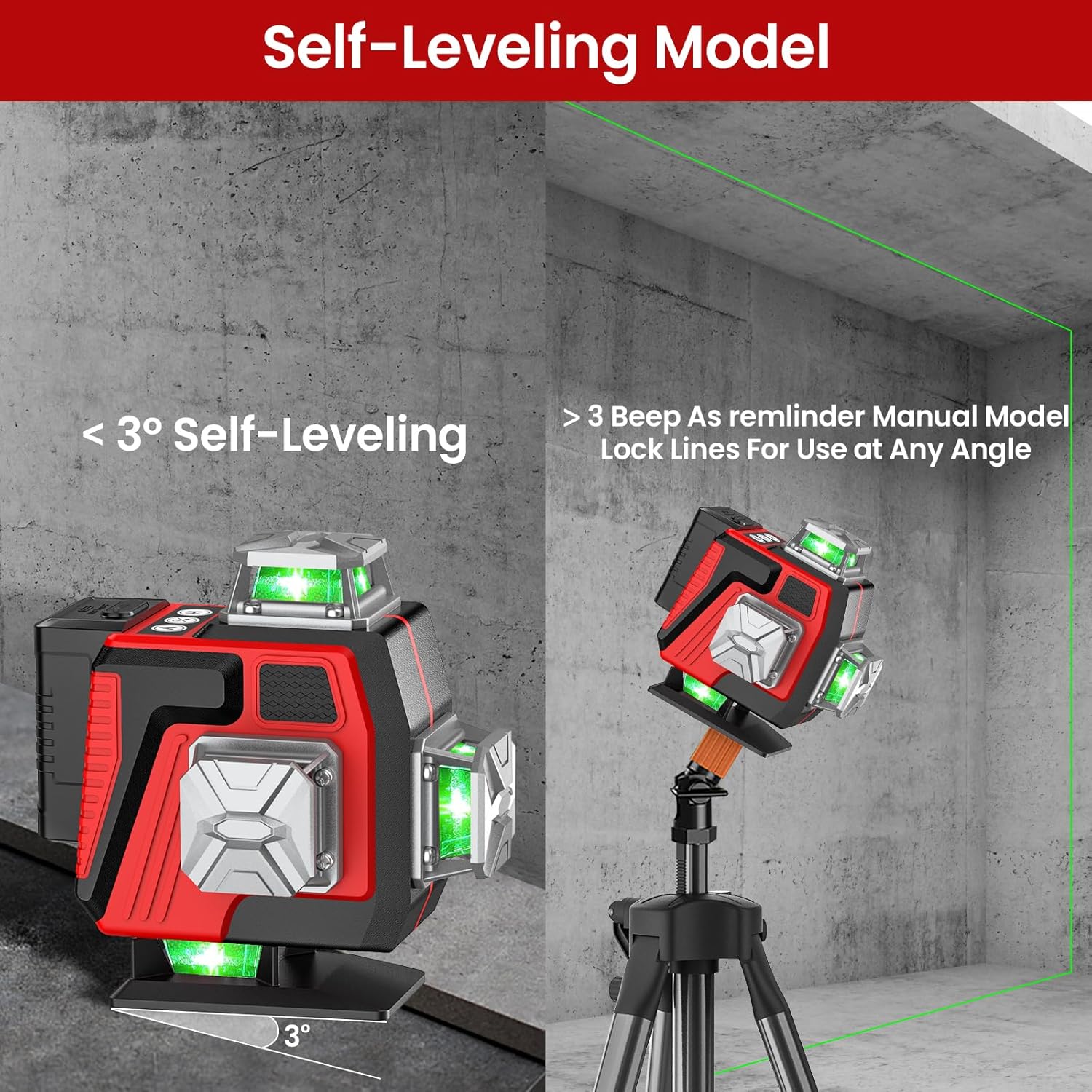 - 【Self-Leveling & Manual Mode】Im Selbstnivelliermodus wird der Lasernivellier innerhalb eines Bereichs von ±3° automatisch nivelliert, ansonsten gibt er einen Alarm aus und blinkt weiter. Drücken Sie die Taste „ON“ und halten Sie sie gedrückt,