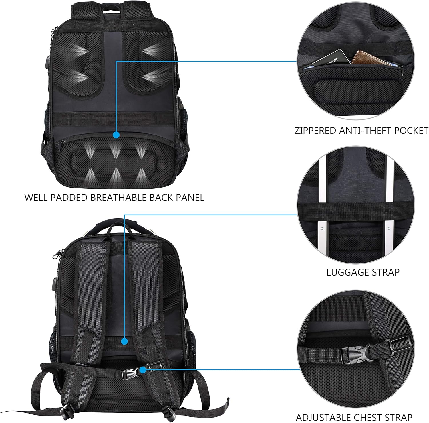 - MULTI-FUNKTIONALES COMPARTMENT: Unser grosser Trvel-Rucksack mit getrennten Fächern und Taschen bietet Platz für Computer, iPad, Powerbank, A4-Dateien, Brieftasche, Stifte, Karten, Kleidung und mehr An jeder Seite können Sie Ihren Regenschirm, Ihre