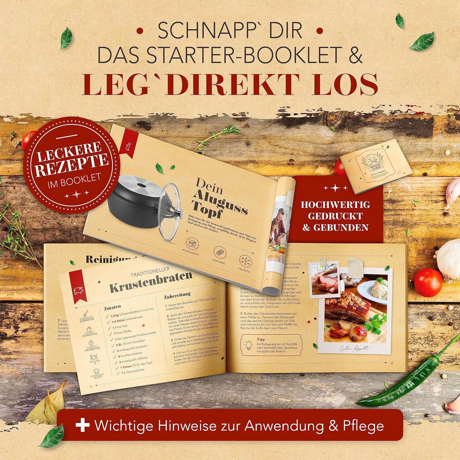 - MODERENES KOCHERLEBNIS - Mit Deinem neuen Aluguss Topf und ZWEI Deckeln (1x Aluminium und 1x Glas) kannst Du dank beiliegender Rezeptvorschläge direkt starten und in die Welt der modernen Küche eintauchen