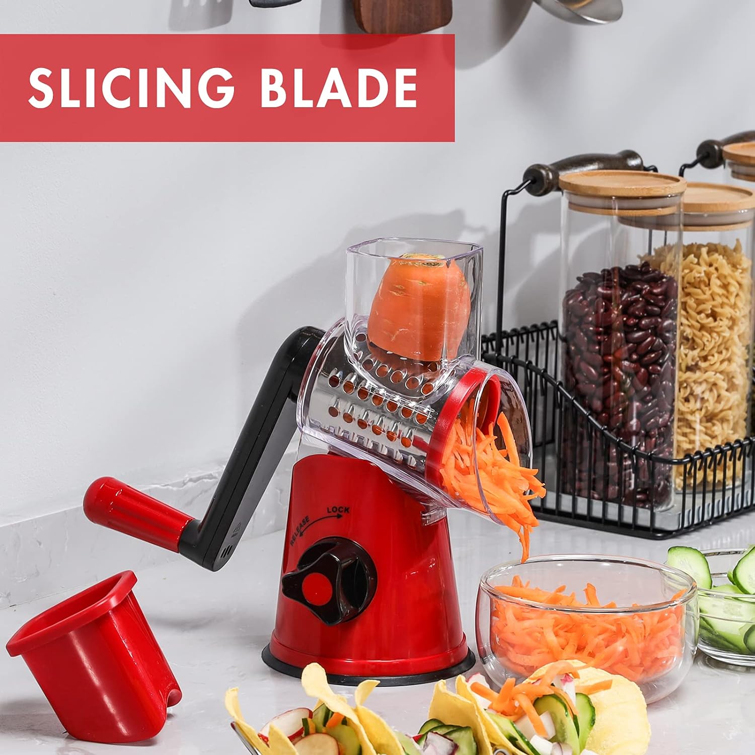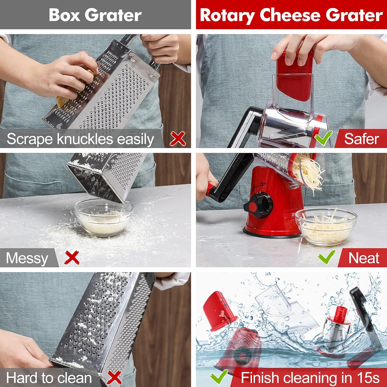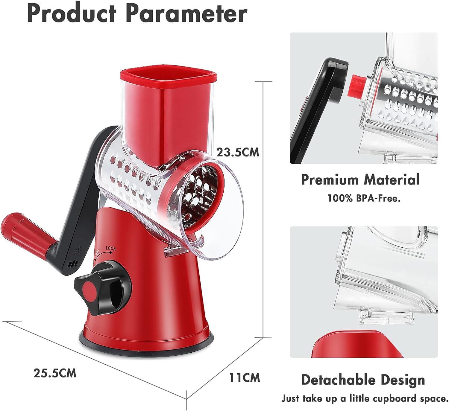 - 🧀 Sicher und effizient: Diese Reibe besteht aus BPA-em ABS-Kunststoff und entspricht den Standards der Lebensmittelsicherheit. Beim Schneiden reduziert die Verwendung des Schiebers zum Schieben der Zutaten, ohne die Klinge zu berühren, die