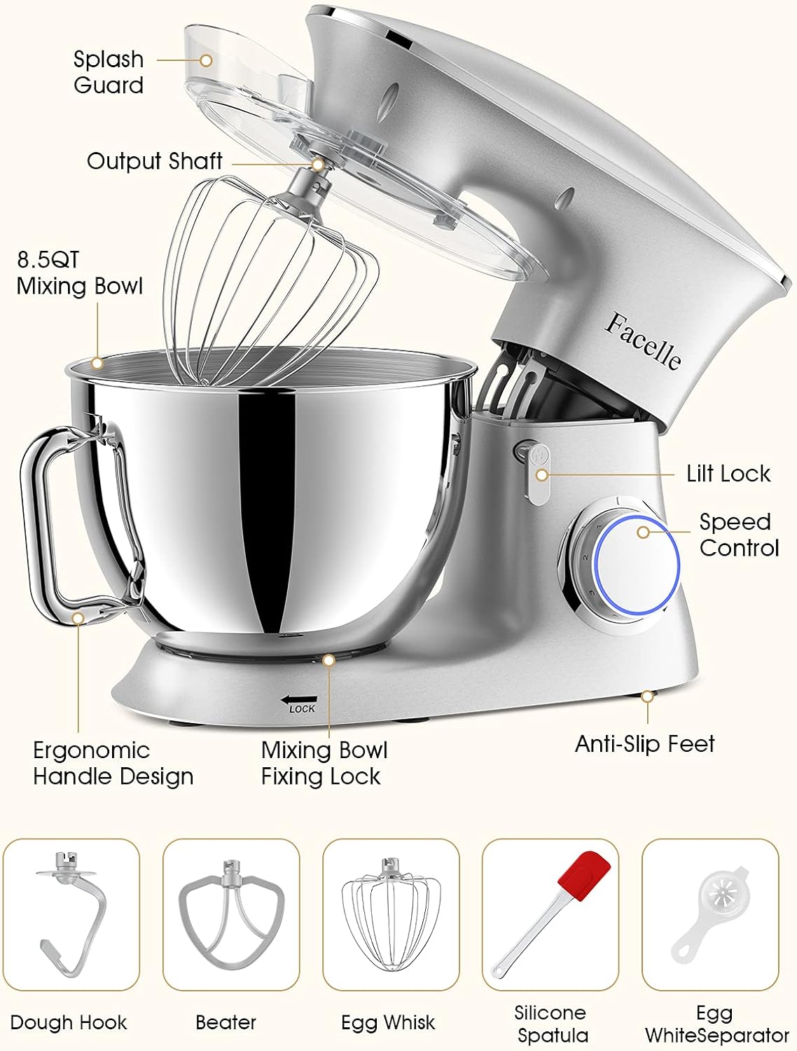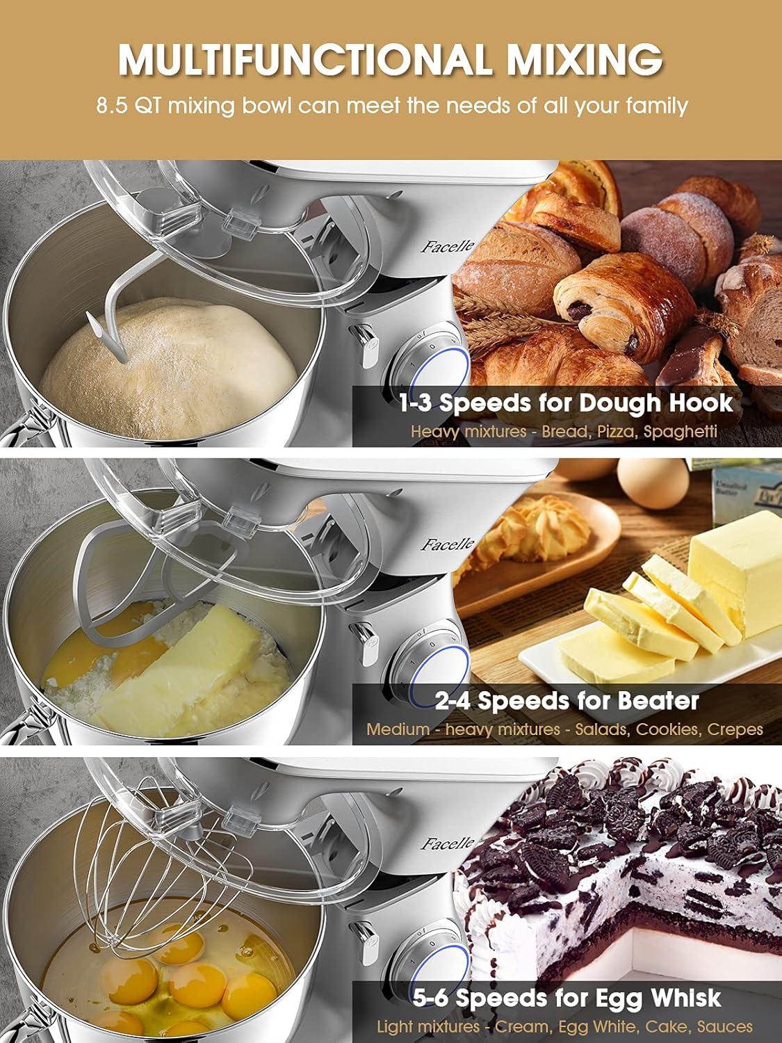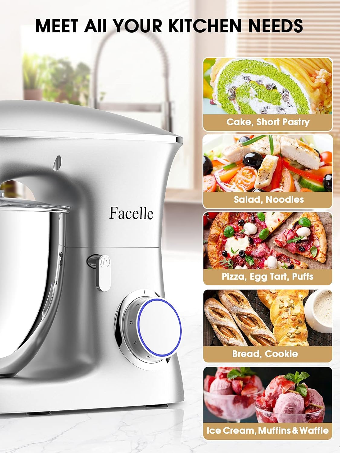 - 🍰【Leistungsstarker 1500-W-Motor】 Der elektrische Küchenmixer von Facelle verfügt über einen hochwertigen Handmotor mit 1500W Stromverbrauch, eine lange Lebensdauer und eine starke Leistung, um die meisten Ihrer Anforderungen an einen