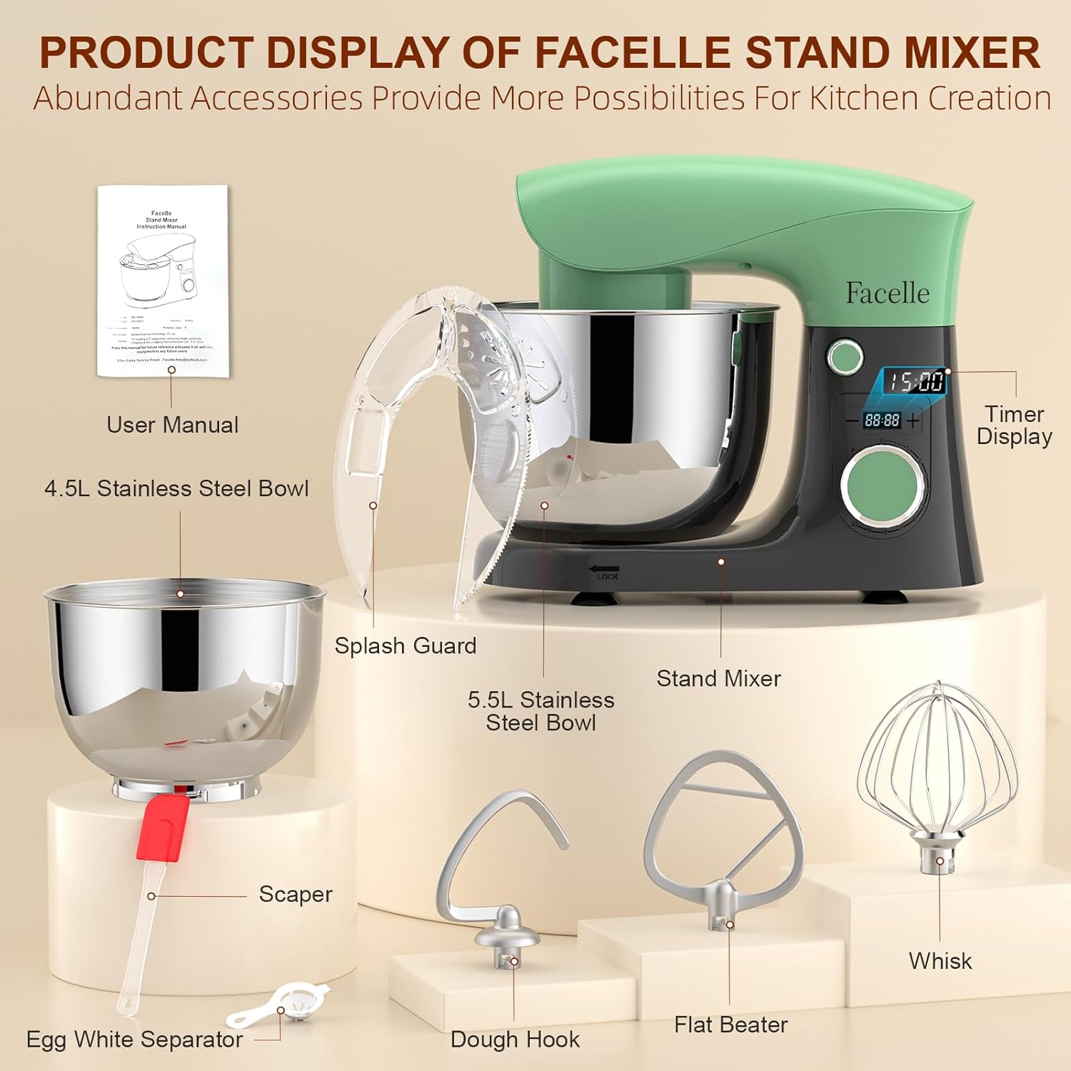 - ★HOCHWERTIGE 5,5 L + 4,5 L MISCHSCHÜSSELN: Facelle elektrische Küchenmixer ist mit zwei Schüsseln aus lebensmittelechtem Edelstahl ausgestattet. Wir können problemlos eine neue Schüssel austauschen, ohne beim Backen auf das Reinigen der Schüssel