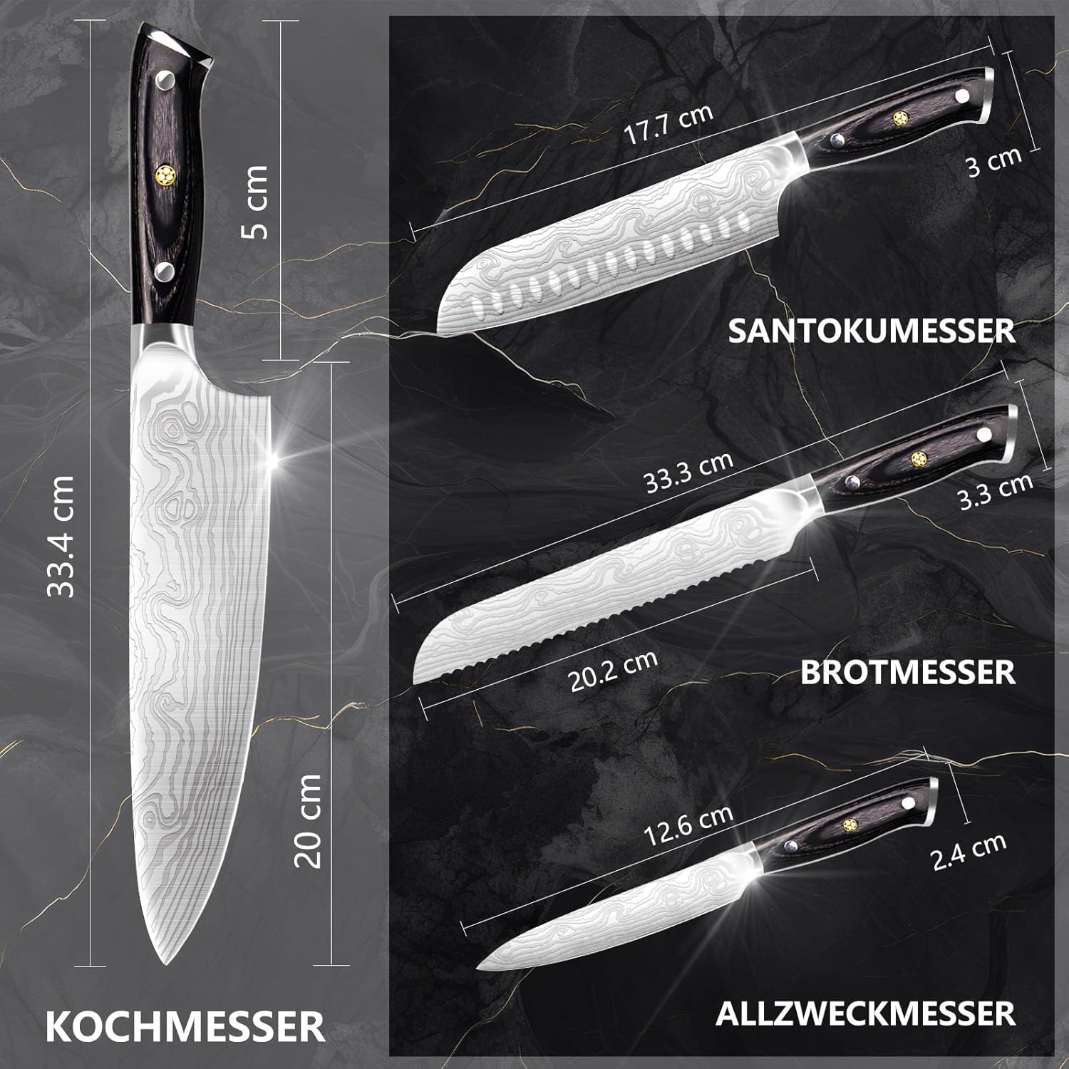 - 🔪 PROFI KÜCHENMESSERSET - Das Profi Messer Set aus Hochwertiger Spezialedelstahl 5Cr15MoV enthält ein Kochmesser (Messer: 20 cm / Klinge: 13 cm), ein Brotmesser (Messer: 20 cm / Klinge: 13 cm) , ein Allzweckmesser (Messer: 13 cm / Klinge: 11.5 cm)