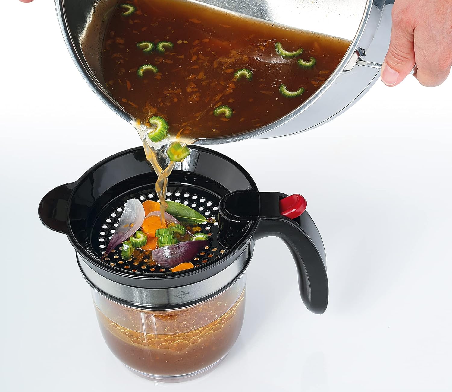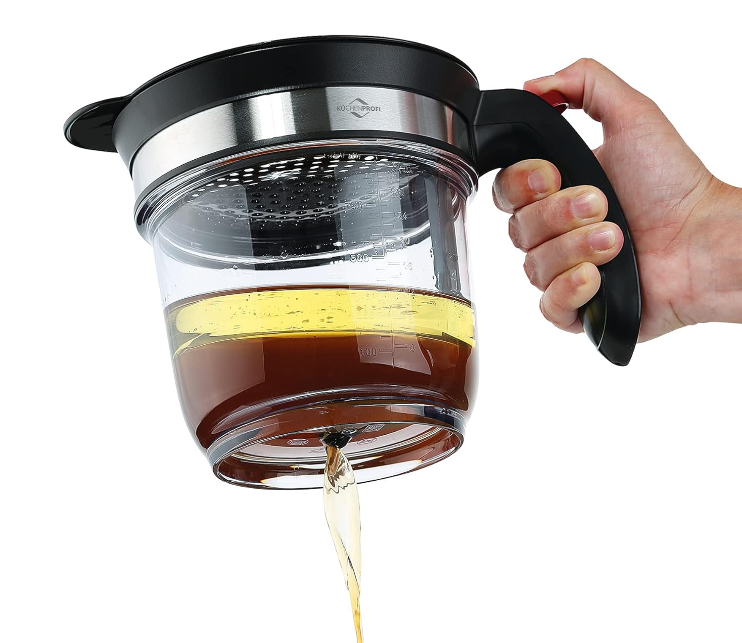 - PRAKTISCH. Mit dem Fettabscheider inklusive Sieb für grobe Reste lassen sich Suppen, Saucen und Bratensäfte mühelos und schnell von überschüssigem Fett trennen. Da sich dieses oben absetzt, kann die reine Kochflüssigkeit durch das Bodenventil