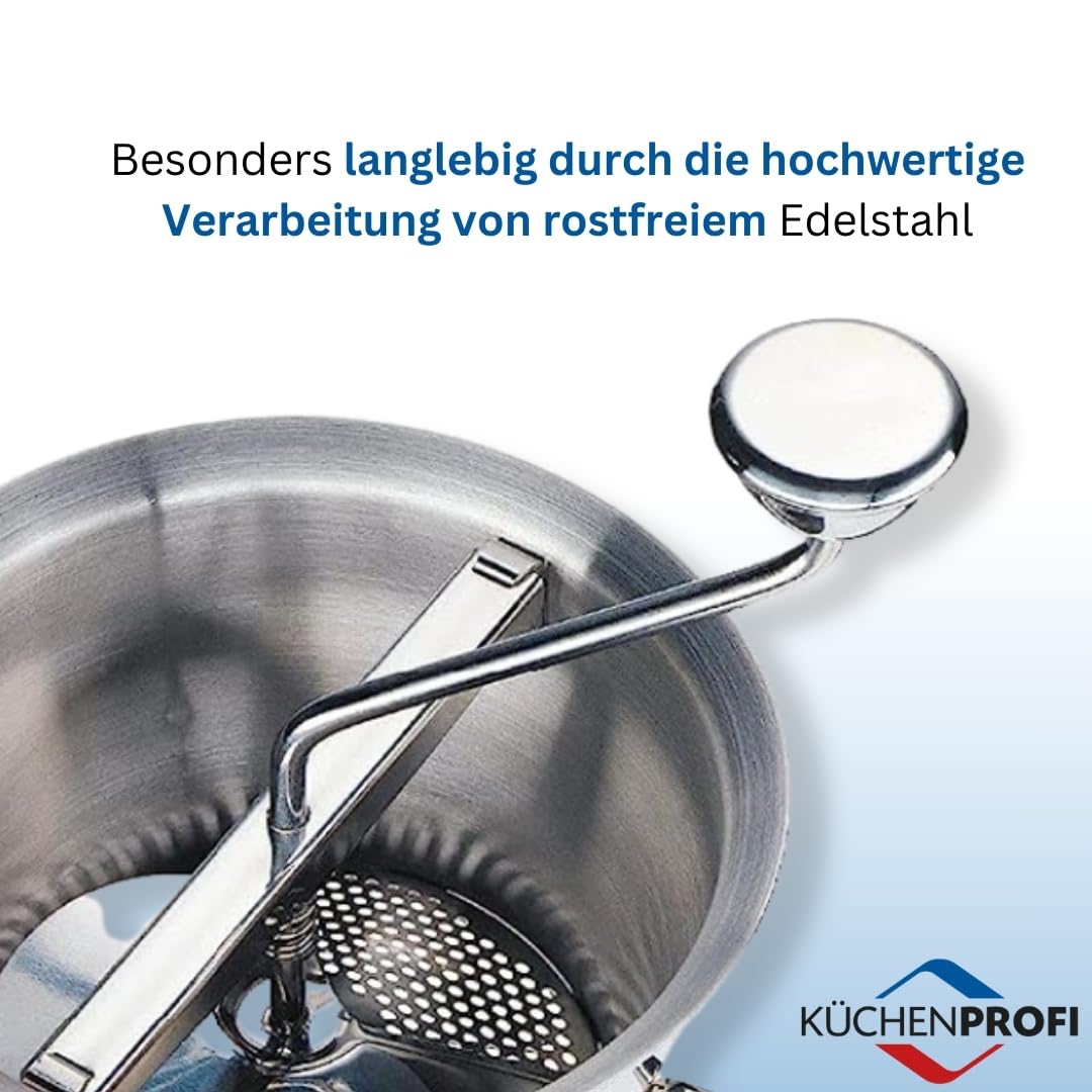 - LANGLEBIG: die hochwertige Verarbeitung von rostfreiem Edelstahl macht die Küchenprofi Passiermühle zu einem robusten und langlebigen Küchenhelfer.