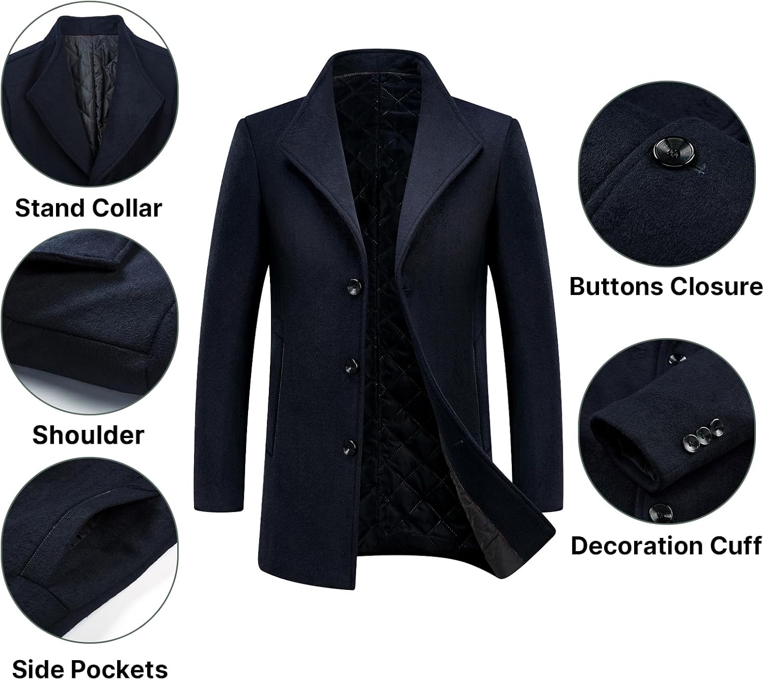 - Wintermäntel für Herren, einreihig, Stehkragen und zwei Seitentaschen, und 2 Innentaschen, langer Slim Fit Trenchcoat Wolljacke.