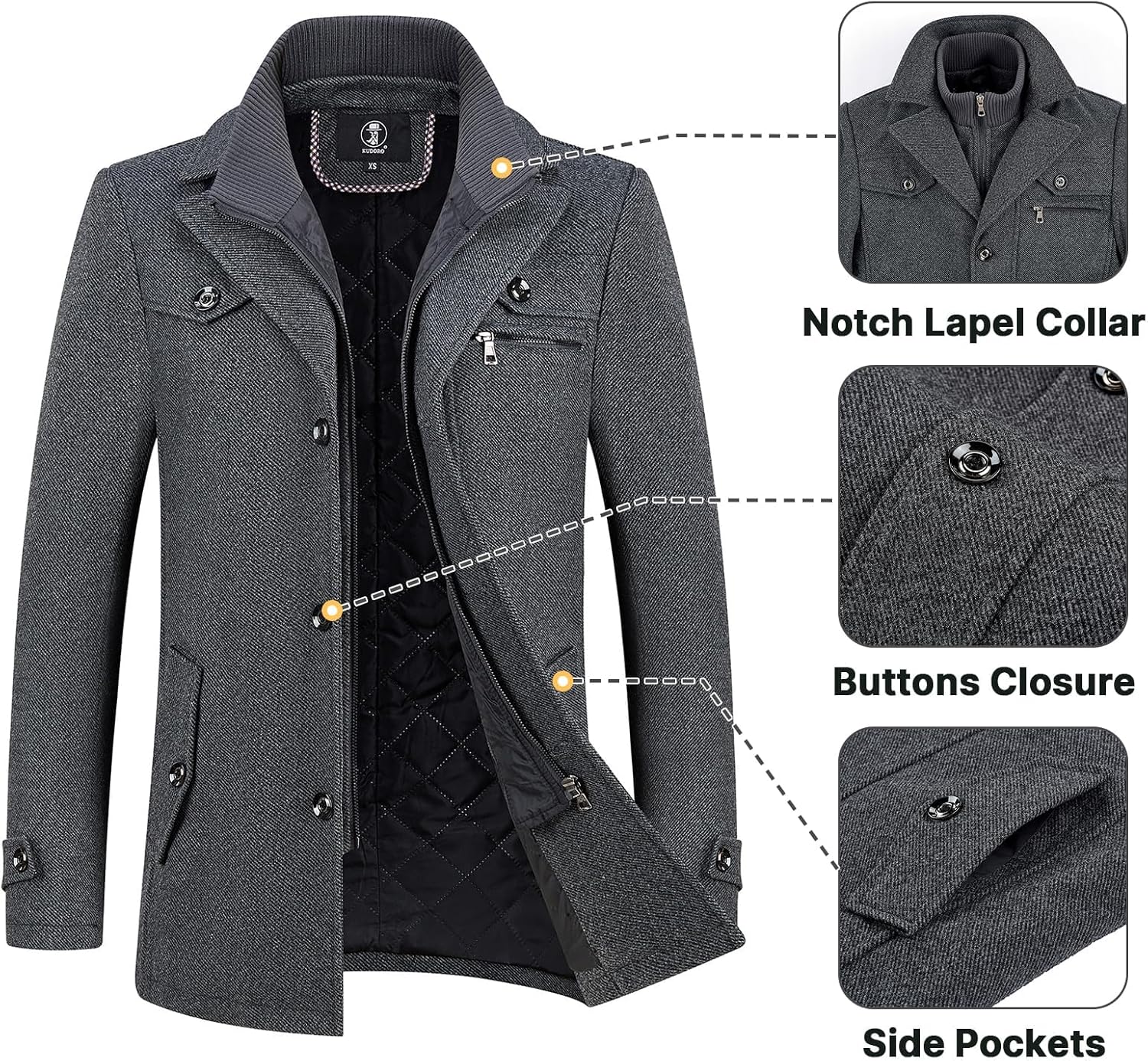 - Wintermäntel für Herren, einreihig, Stehkragen und zwei Seitentaschen, und 2 Innentaschen, langer Slim Fit Trenchcoat Wolljacke.