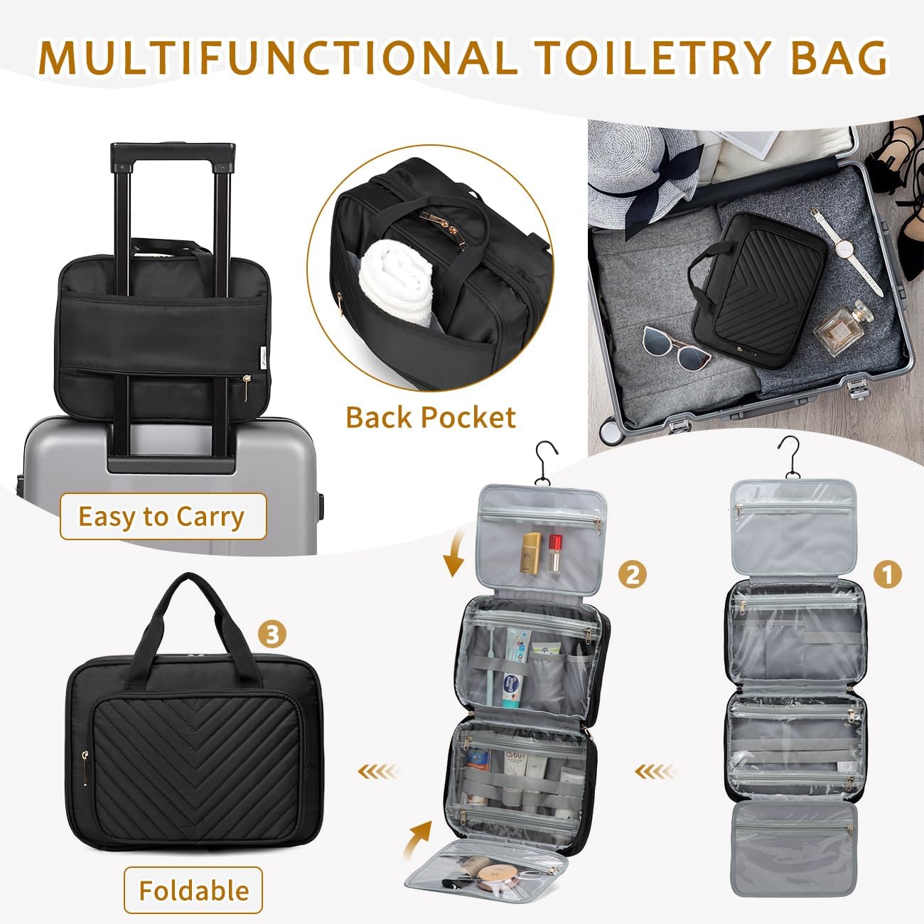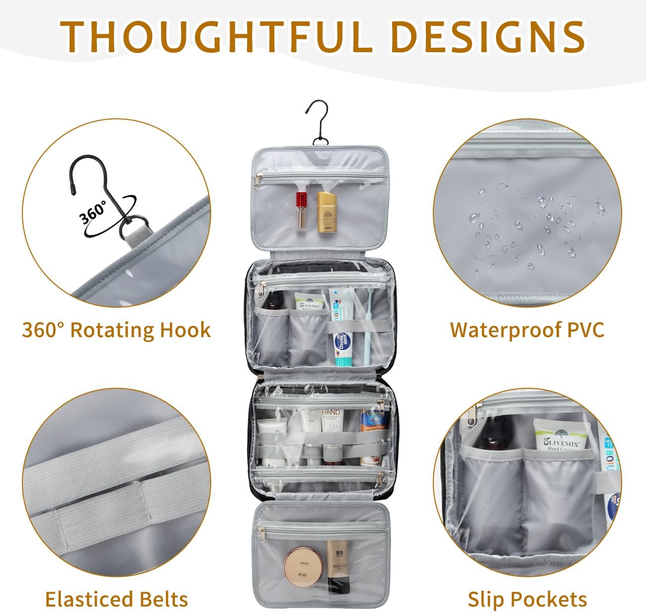 - ✈ GUT ORGANISIERT: Das faltbare und kompakte Design verfügt über einen 360-Grad-Metallhaken zum Aufhängen im Handtuchhalter oder Türknauf, und elastische Bänder in verschiedenen Grössen, um Toilettenartikel zu sichern und zu verhindern, dass sie