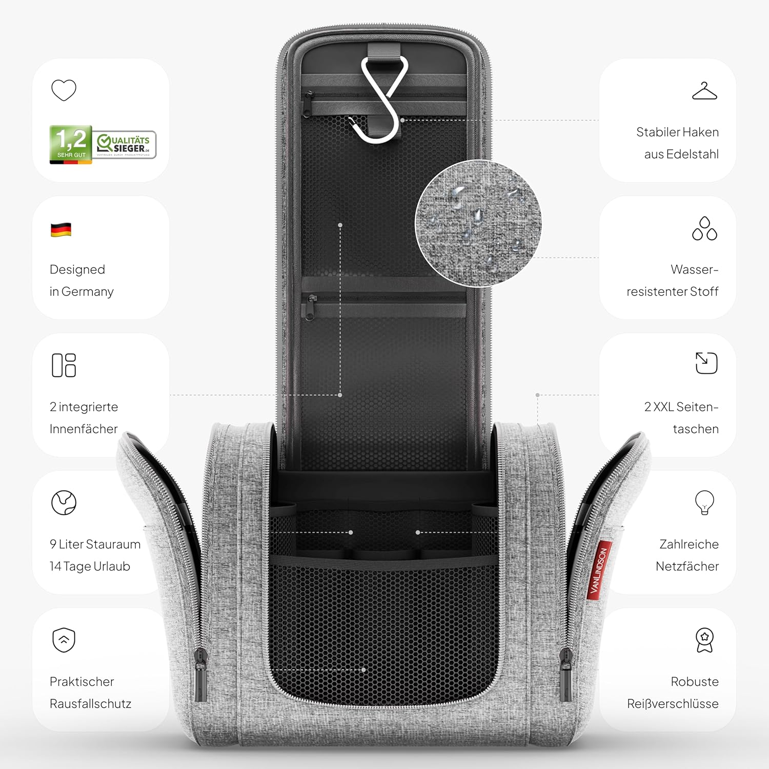 - Ideal fürs Reisen - Optimierter Reise Kulturbeutel: Der VanLindson Kulturbeutel hilft Zeit und Nerven beim Packen zu sparen. Perfekt als Waschtasche Herren und Waschtasche Damen, konzentrieren Sie sich auf Ihre Abenteuer.