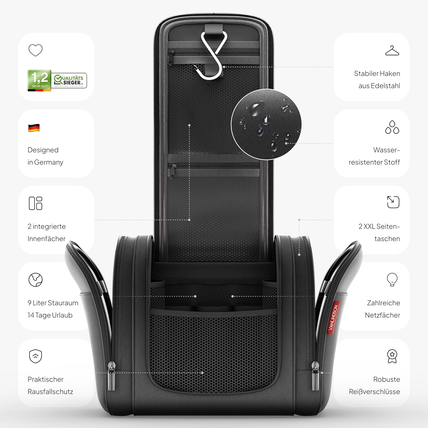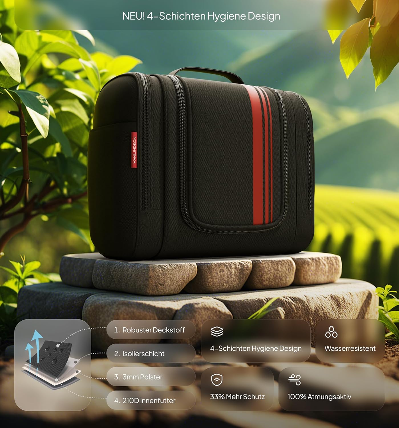 • Ideal fürs Reisen - Optimierter Reise Kulturbeutel: Der VanLindson Kulturbeutel hilft Zeit und Nerven beim Packen zu sparen. Perfekt als Waschtasche Herren und Waschtasche Damen, konzentrieren Sie sich auf Ihre Abenteuer.