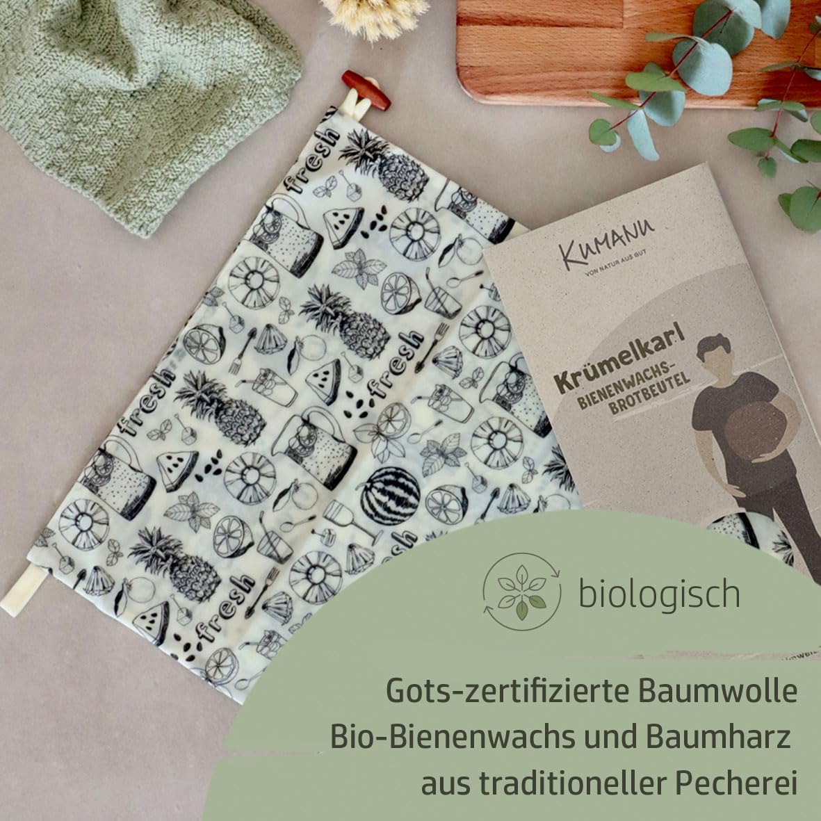 - 🌱 biologisch - wir verwenden nur biozertifizierte Rohstoffe. Aus GOTS BioBaumwolle, Bio-Bienenwachs und Baumharz aus traditioneller Pecherei entstehen unsere Bienenwachstuchprodukte.