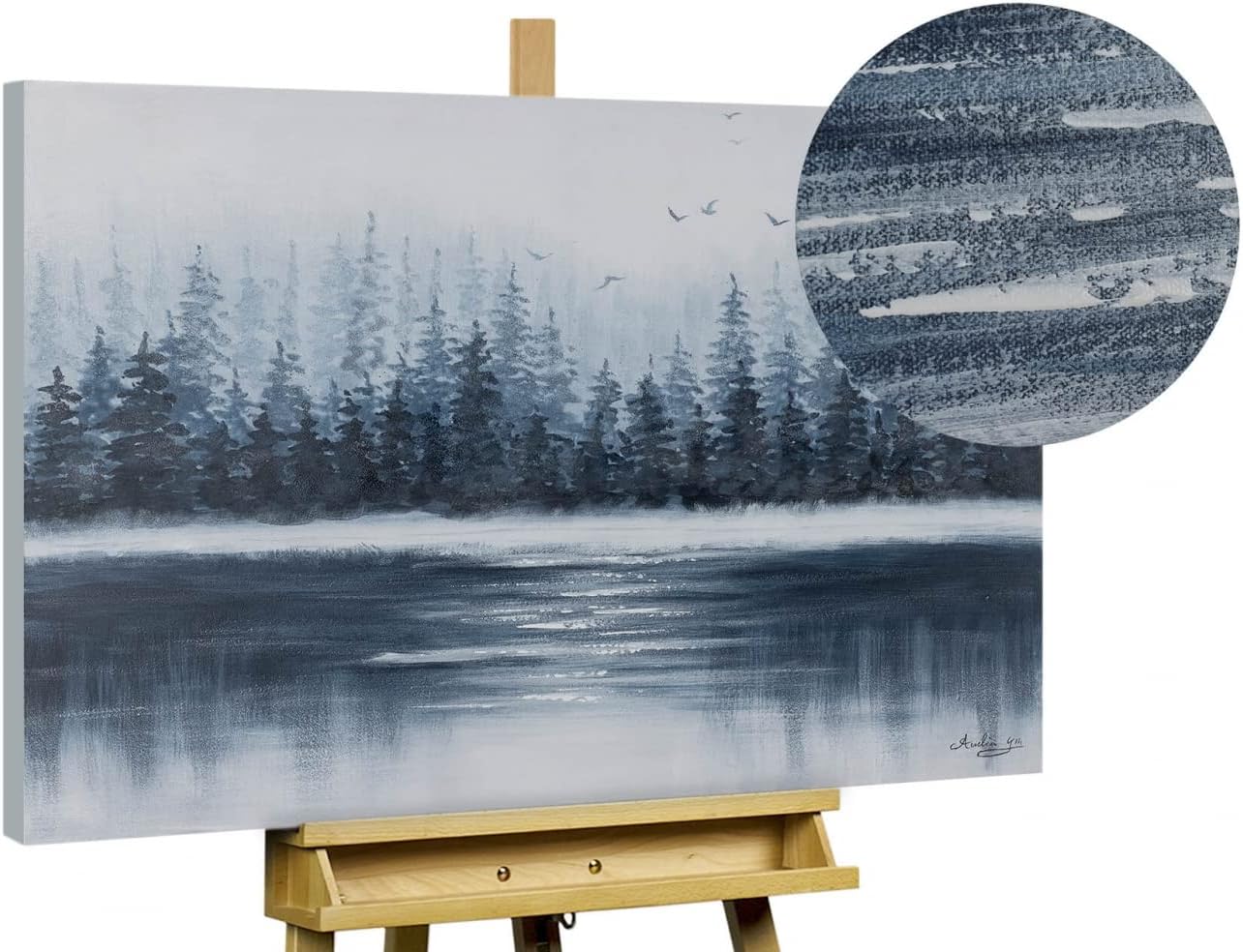 KunstLoft Leinwandbild | 100% HANDGEMALT | 100x75cm | GemÀlde 'Tannen im Nebel' | Wald & BÀume | Bla