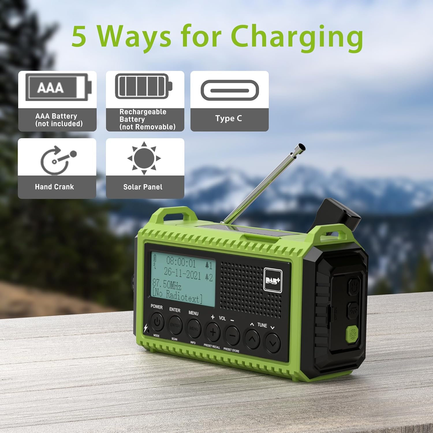 - 📻TFünf Lademethoden & Notfallradio: DAB+ Radio über USB-Kabel, Solarpanel, AAA-Batterie(nicht enthalten), Eingebauter Akku mit grosser Kapazität oder Handkurbel aufgeladen werden. Es über einen wiederaufladbaren 5000 mAh Akku verfügt, können Sie Ihr Mobiltelefon oder andere Geräte auch über ein USB-Kabel aufladen. In Notfällen oder Outdoor-Abenteuern Solar-Kurbelradio als Stromquelle verwendet werden, was sehr praktisch ist. Handschlaufe und der Karabiner erleichtern das Anbringen am Rucksack.