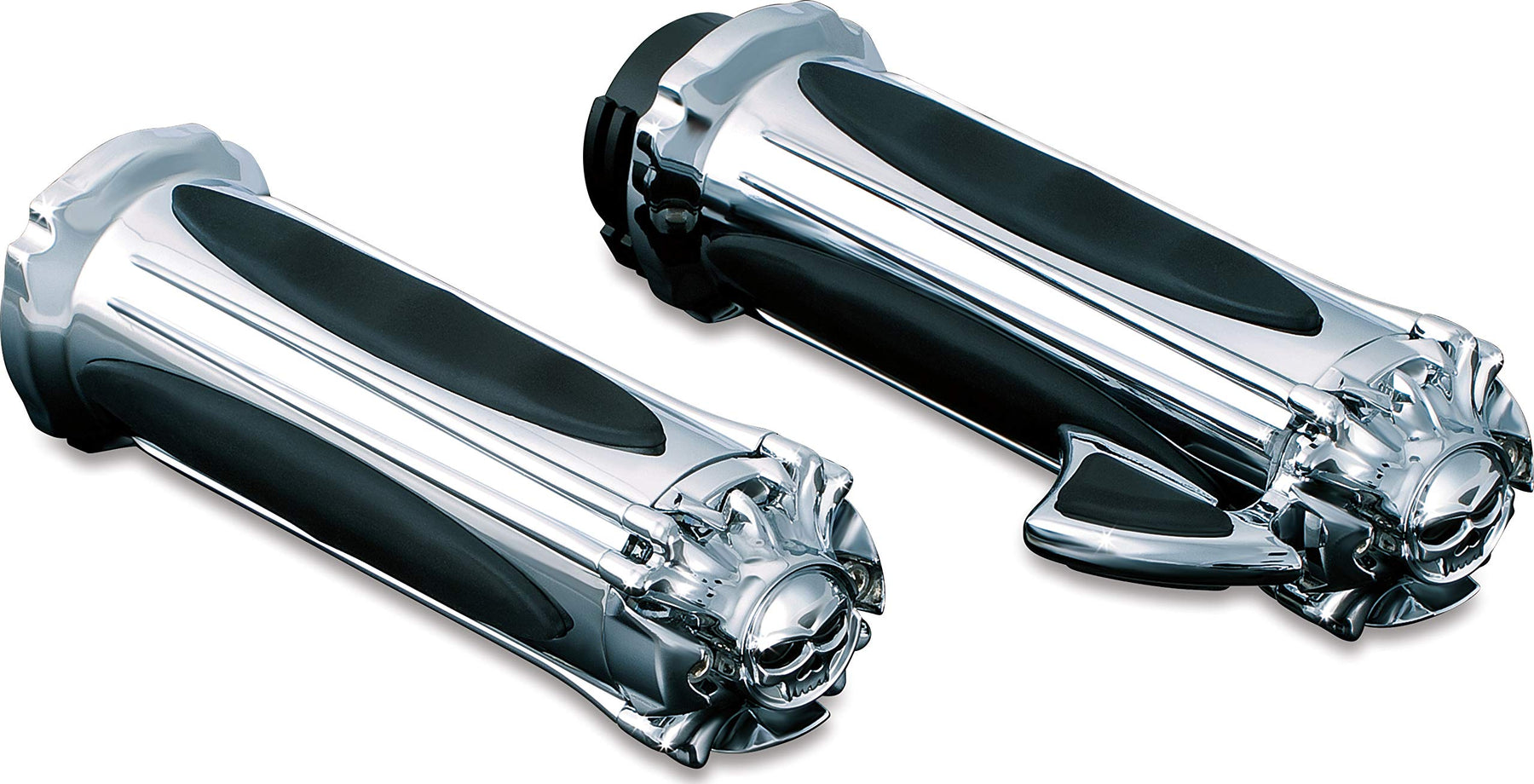 - Chrom-Zombie-Griff für Doppelzug-Gaszug; verbessert mit dem verstellbaren Drosselboss-Paddel, das dem Fahrer ermöglicht, den Griff auf dem Gas zu entspannen und gleichzeitig eine konstante Geschwindigkeit beizubehalten