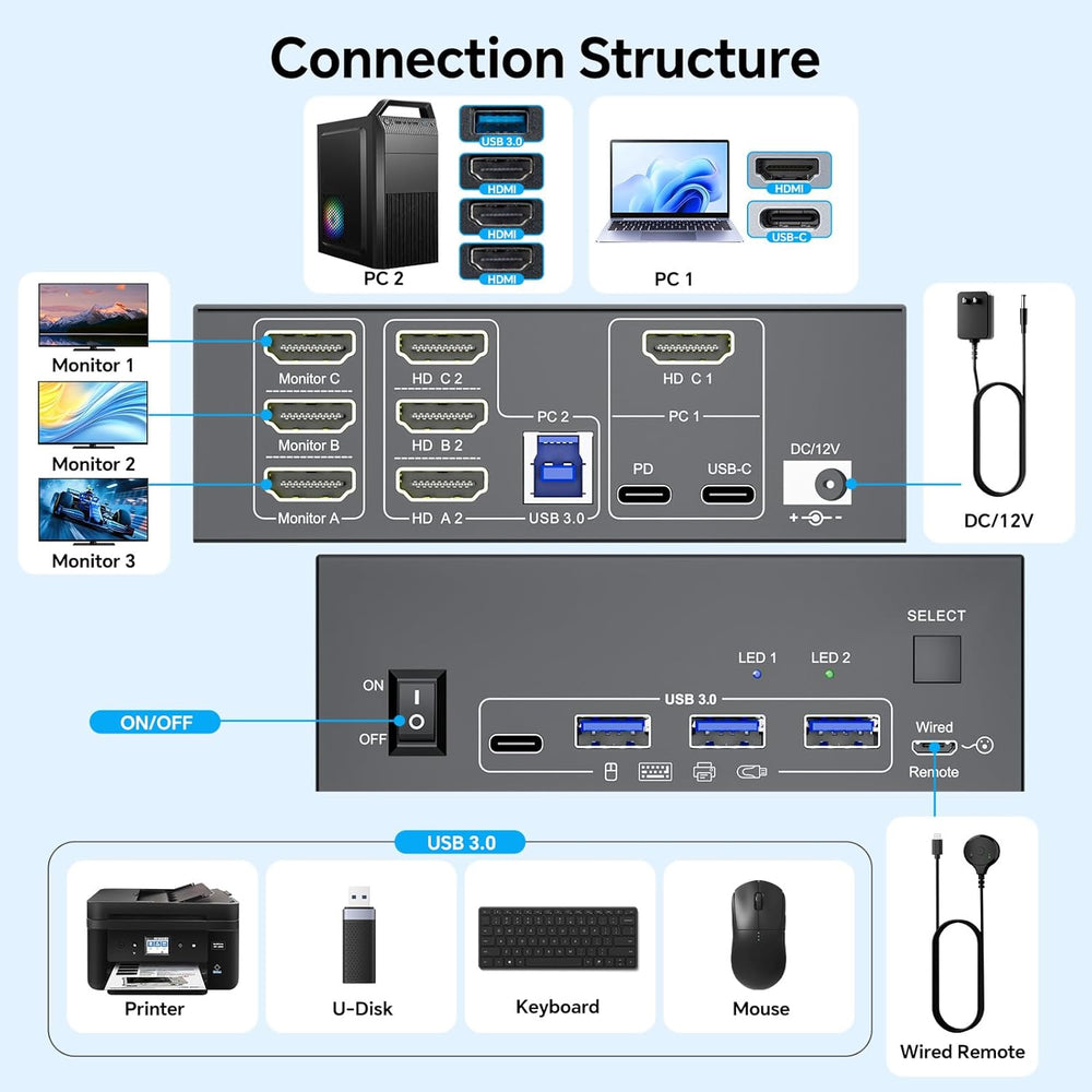 - 【HDMI- und USB-C-KVM-Switch für drei Monitore】 Dieser USB C KVM Switch für 3 Monitore und 2 Computer verfügt über 1x HDMI + 1x USB-C (MST)-Eingang für Laptops und 1x integrierten HDMI + HDMI + HDMI + USB-Eingang für Desktops. Ermöglicht die