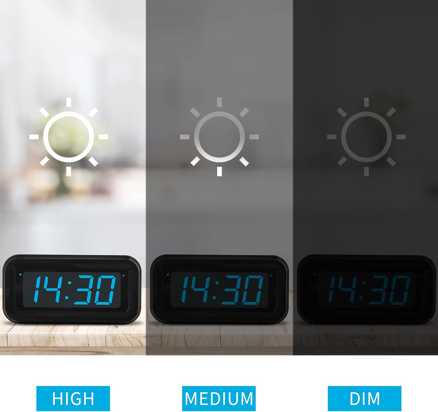 - Wecker für Schlafzimmer - Es gibt 3 Helligkeitsstufen für Ihre Optionen (Tageszeit), hoch/mittel/niedrig. Die Uhr wechselt in den Nachtmodus und dimmt automatisch um 20:00 Uhr ~ 6:00 Uhr, um Ihre Augen nachts zu schützen und Energie zu sparen. Keine