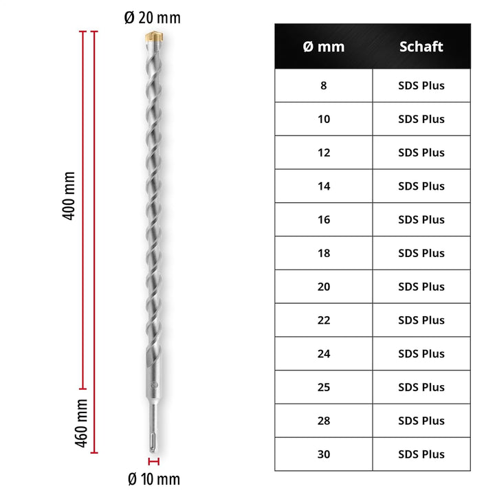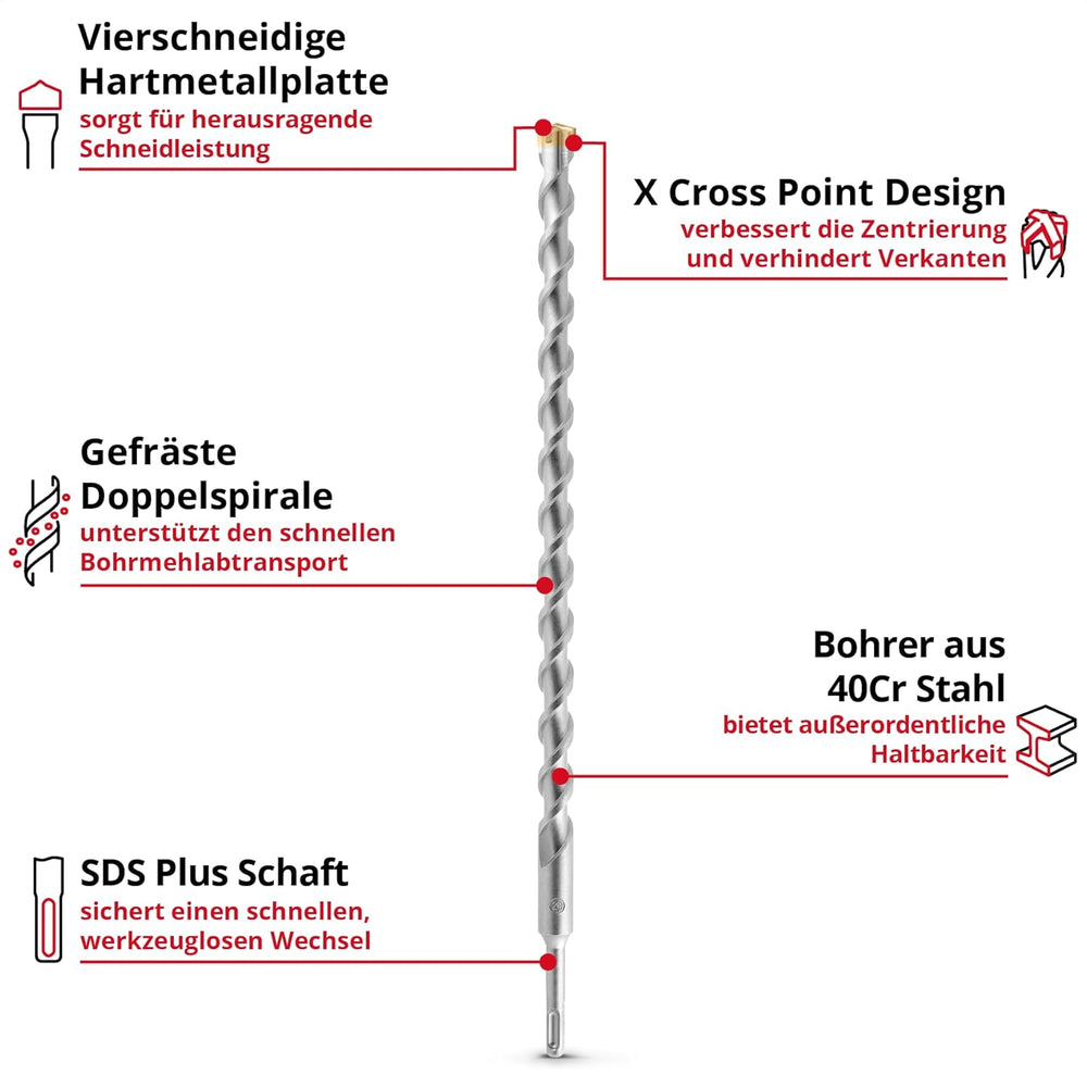 - Optimierte Bohrleistung – Durch das innovative Design und erstklassige Materialien sorgt der Steinbohrer für eine effiziente Zerspanung und erleichtert das Bohren in harten Materialien wie armiertem Beton.
