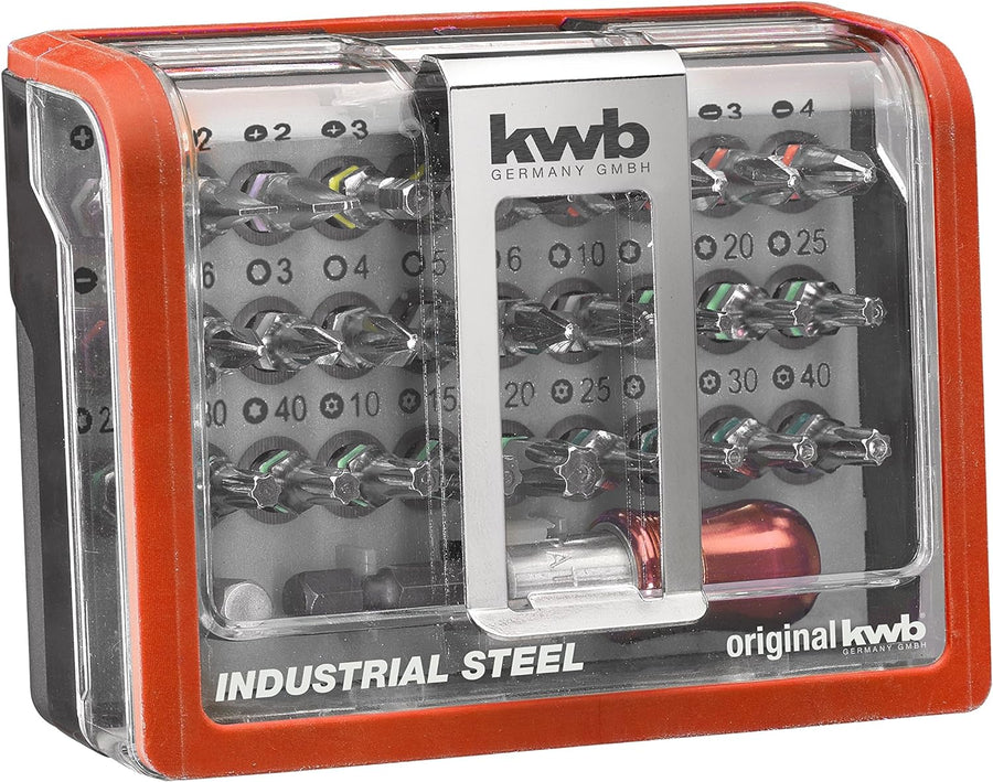 - Umfangreiches Bit-Set, bestehend aus 25 mm und 50 mm Bits mit Mega-Grip Rips, Bit-Halter und Adapter in robuster Kunstoff-Box mit praktischem Gürtel-Clip.