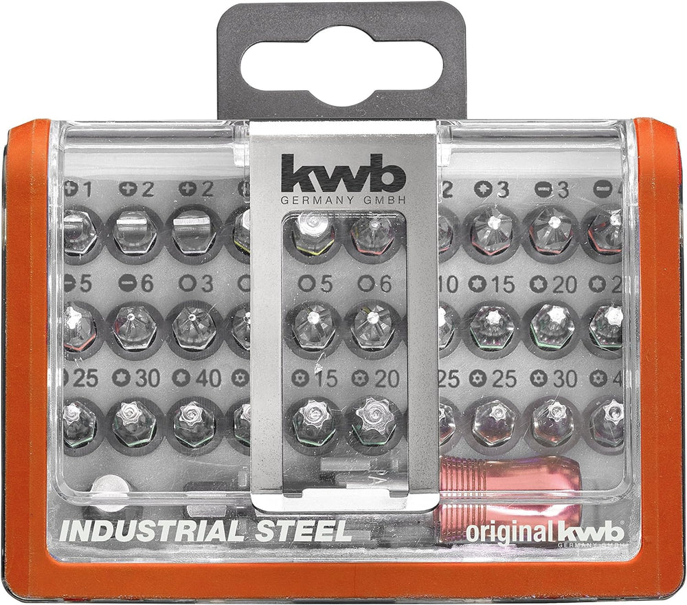 - Folgende Bits und Wekrzeuge sind unter anderem enthalten: 1x 1/4 E 6.3 Magnet-Halter und Antrieb, 1/4 Zoll Steckschlüssel-Adapter, 2x PH 1, 3x PH 2, 1x PH 3, 2x PZ 1, 3x PZ 2, 1x PZ 3, Schlitz 4 mm, 5 mm u. 6 mm, Torx und Tamper-Torx Bits.