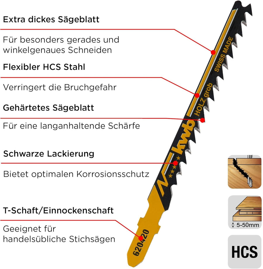 - FLEXIBLER HCS-STAHL: Durch die Fertigung aus HCS Kohlenstoffstahl besteht eine geringe Bruchgefahr beim Arbeiten mit den Stichsägeblättern für Holz.