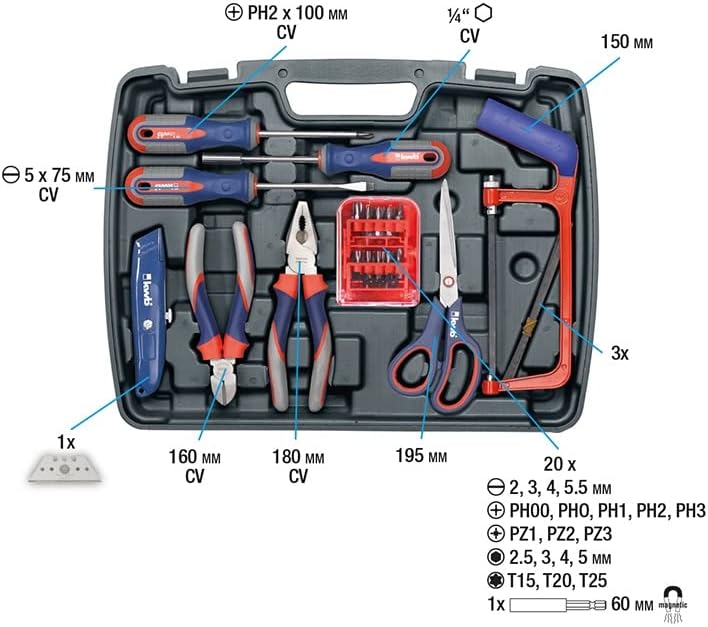 - PERFEKTE GRUNDAUSSTATTUNG: Die kleine Werkzeugbox ist mit den wichtigsten Werkzeugen für jeden Anlass befüllt und eignet sich für den Haushalt, die Garage, die Werkstatt und durch den Kunststoff-Tragegriff für den mobilen Einsatz, wie zum Camping.