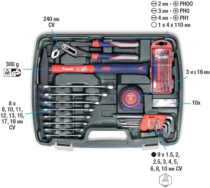 - ALLROUNDER: Ausgestattet mit den wichtigsten Werkzeugen bietet der 65-tlg. kwb Werkzeugkoffer neben Hammer, Sechskant-Stiftschlüsseln, (Präzisions-)Schraubendrehern und Zangen auch ein 20-tlg. Bit-Set, Massband, Schere und Trapezklingenmesser.