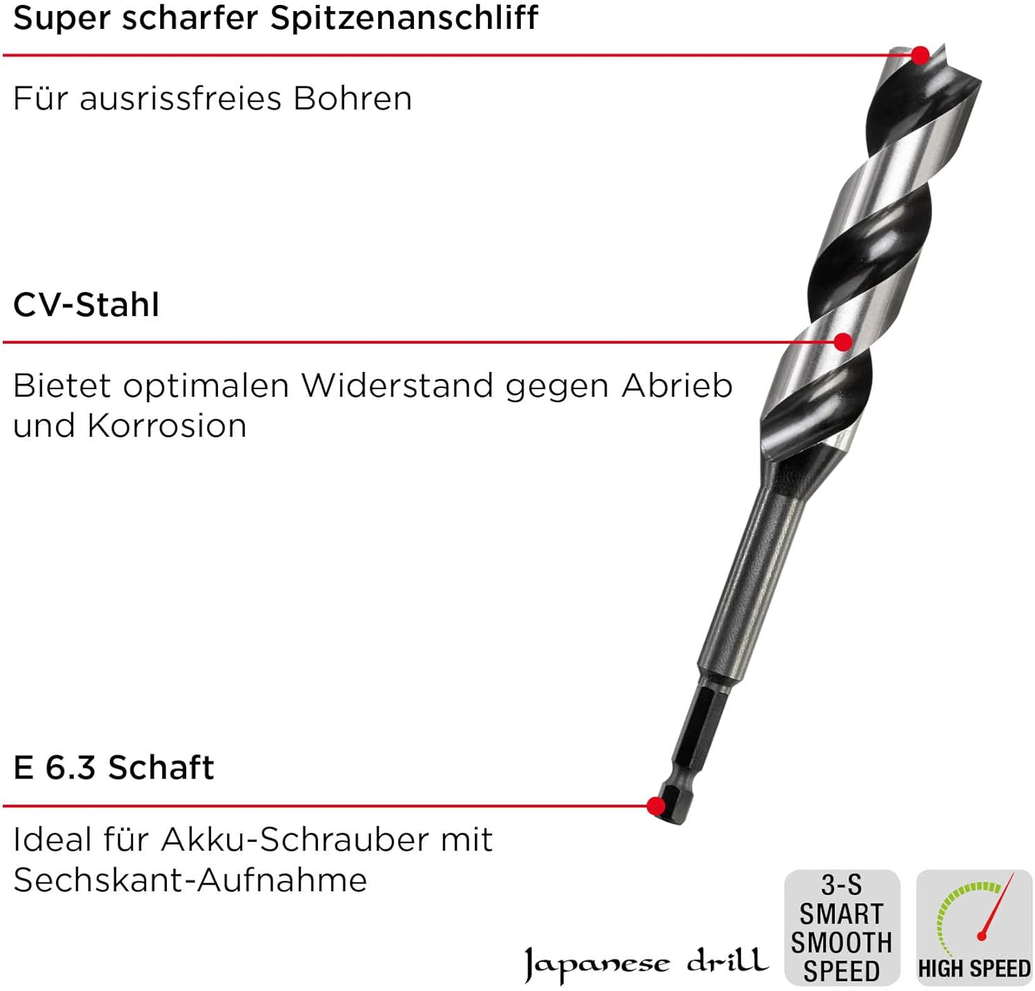 - ZENTRIERSPITZE: Mithilfe der Zentrierspitze ist ein präzises Ansetzen an der Bohrloch-Mitte möglich, sodass der Japan Schlangenbohrer nicht verrutscht.