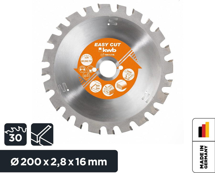 - NAGELSICHER: mit Metall verunreinigte Hölzer sind oft ein Problem, jedoch nicht mit dem Sägeblatt von kwb. Achtung: locker im Holz sitzendes Metall sollte trotzdem vermieden werden, da die Zähne sonst durch Schlag beschädigt werden könnten.
