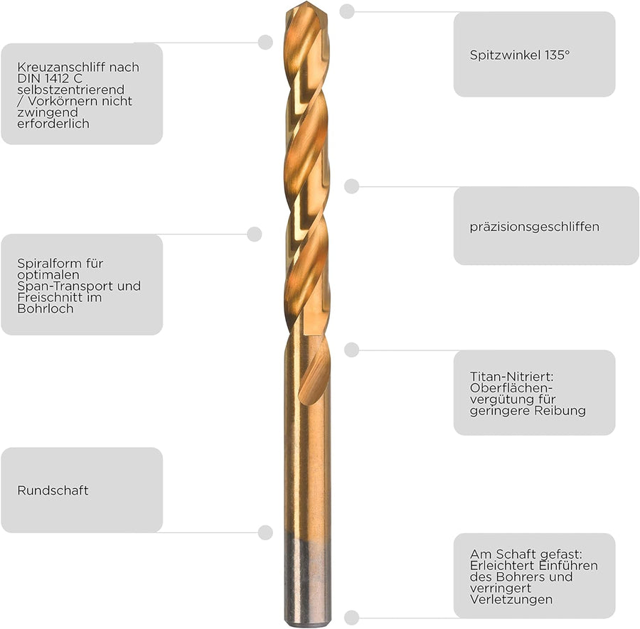 - Rechtsschneidendes Metall-Bohrer Sortiment, präzisions-geschliffen mit 135° Spitzwinkel – der Titanbohrer arbeitet schnell und verursacht nur minimale Zerspankräfte