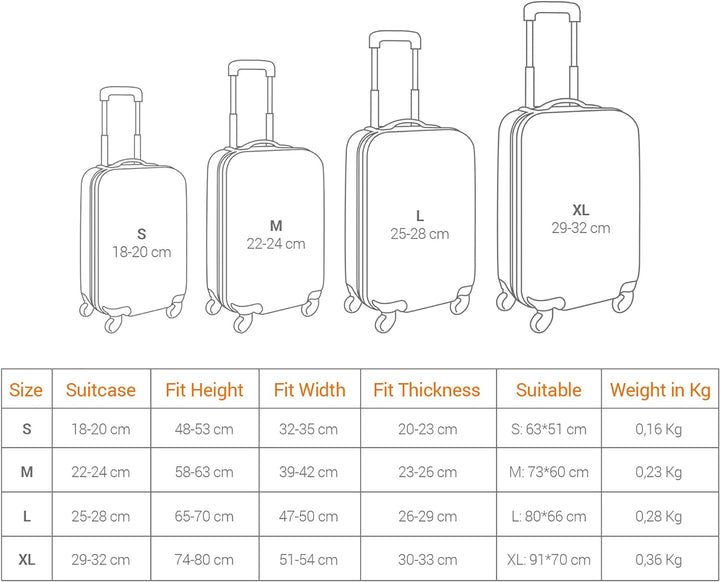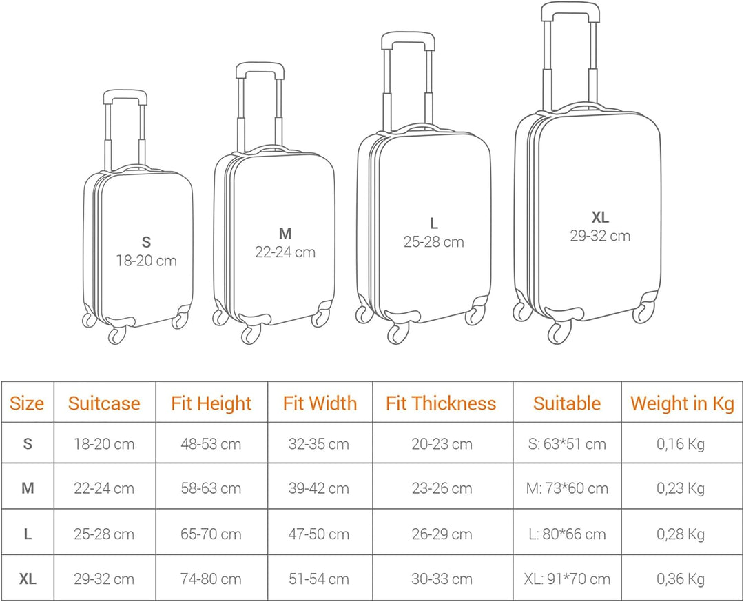 - TECHNISCHE DATEN: Gewicht: 160g (S) / 230g (M) / 280g (L) / 360g (XL); geeignet für folgende Koffergrössen: S (48-53 x 32-35 x 20-23 cm), M (58-63 x 39-42 x 23-26 cm), L (65-70 x 47-50 x 26-29 cm), XL (74-80 x 51-54 x 30-33 cm)