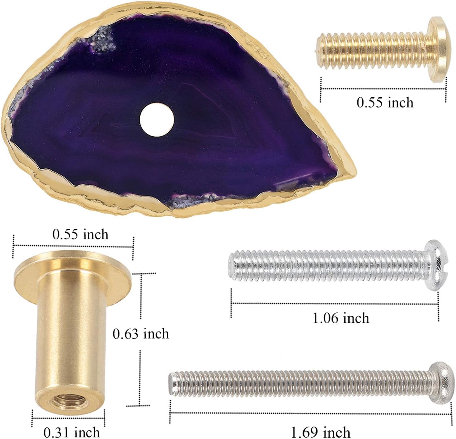 - Grösse für Achat Scheiben Schubladenknöpfe: Achat Scheiben: Länge 5-8 cm, Dicke 0,5 cm; Messing griff: Länge 1.6 cm, minimale Breite 0.8 cm, maximale Breite 1.4 cm. Gewicht: 30-70 g/ Stück. Paket enthält: 4* Möbel Ziehgriffe, 4* 2,7 cm Schrauben,