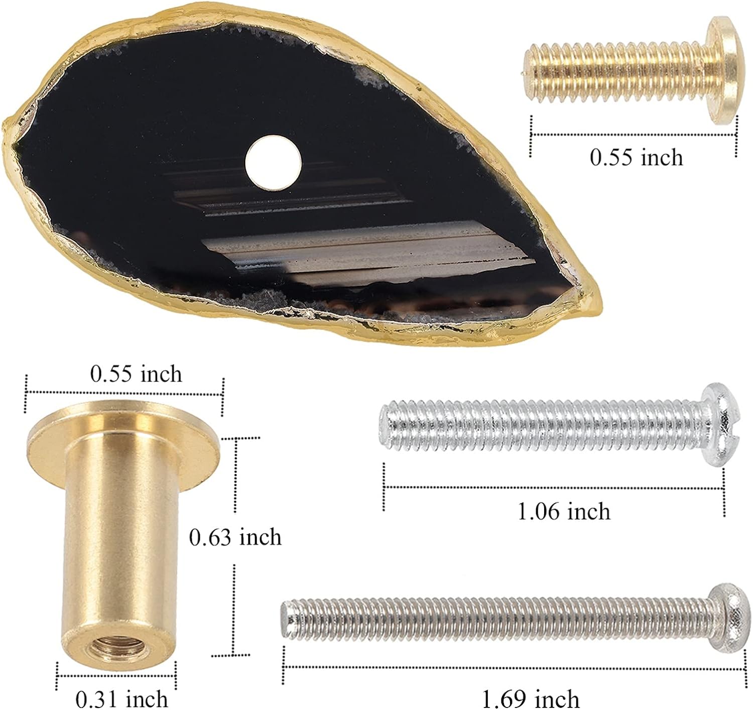- Grösse für Achat Scheiben Schubladenknöpfe: Achat Scheiben: Länge 5-8 cm, Dicke 0,5 cm; Messing griff: Länge 1.6 cm, minimale Breite 0.8 cm, maximale Breite 1.4 cm. Gewicht: 30-70 g/ Stück. Paket enthält: 4* Möbel Ziehgriffe, 4* 2,7 cm Schrauben,