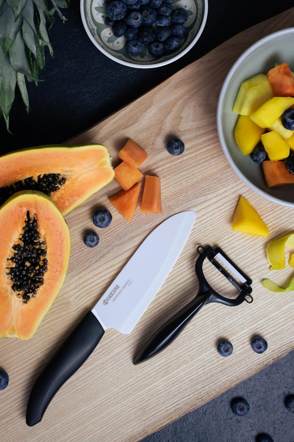- Ideal zum Verschenken oder Kennenlernen: das Geschenkset der Kyocera Gen Serie, bestehend aus Santokumesser (Klinge: 14 cm) und Sparschäler (CP-10NBK) mit schwarzen Griffen.