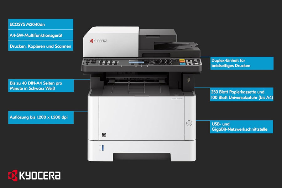 - Zuverlässig: Der Ecosys M2040dn Multifunktionsdrucker Laser dient dem schnellen Drucken, Kopieren und Scannen und überzeugt dank 1200 dpi Auflösung mit höchster Druckqualität