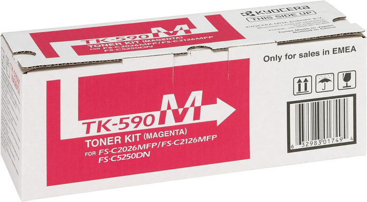 - Lieferumfang: Kyocera 1T02KVCNL0 TK-590M Tonerkartusche Magenta in Originalverpackung mitsamt einer Installationsanleitung sowie einer Entsorgungstüte für die leere Tonerkartusche
