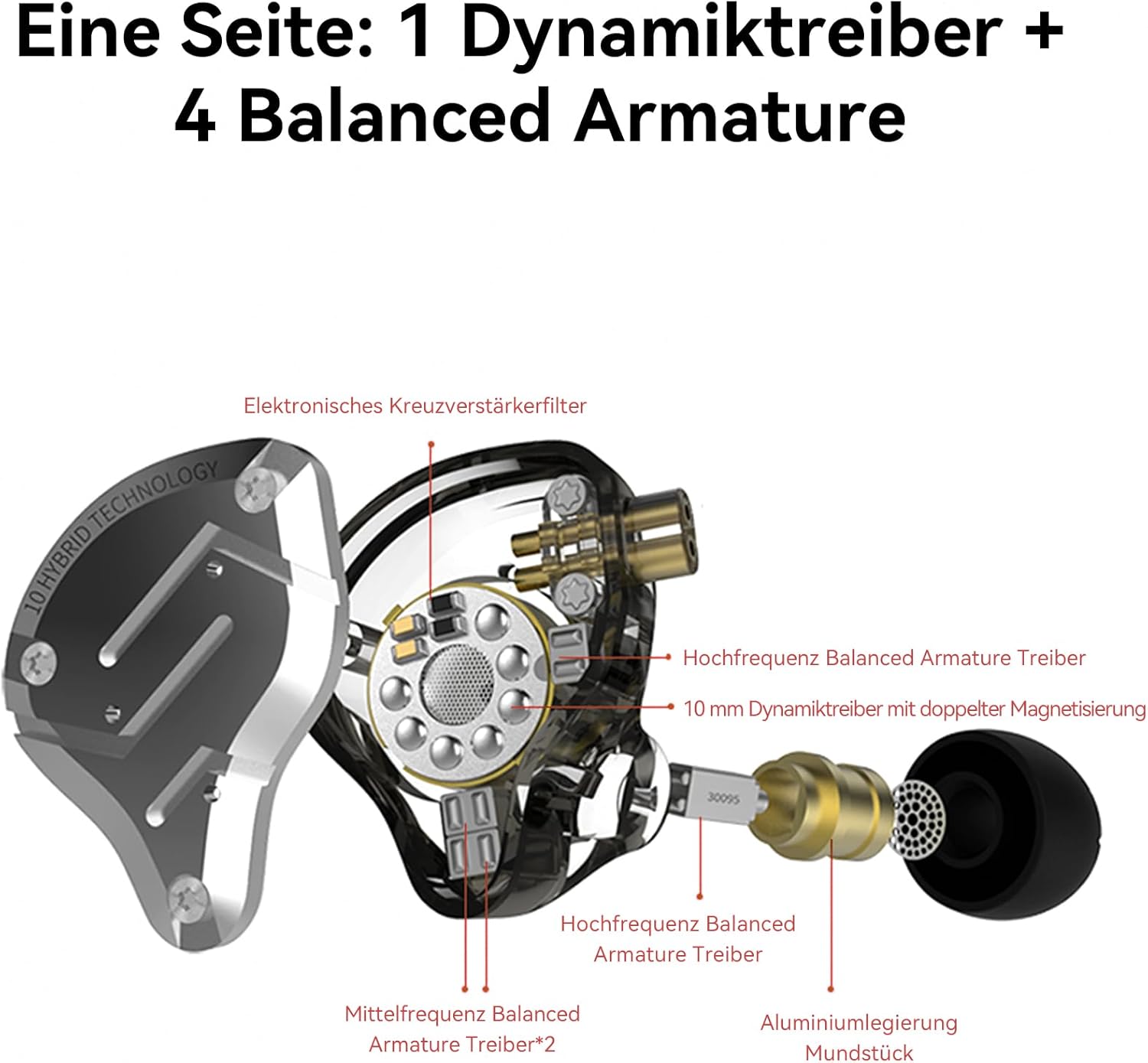 • 【 Verbesserte 5 Treiber 4BA 1DD IEMS KZ ZS10 Pro 】Verbesserte Version von KZ ZS10 verfügt der Pro über selbst angepasste symmetrische Armaturen, die zwei 30095-Treiber für Hochfrequenz, zwei 50060-Treiber für Mittelfrequenz enthalten.Mit dieser